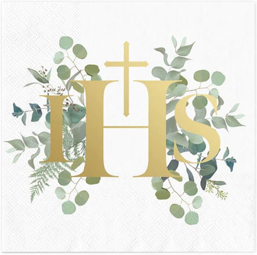 Serwetki komunijne w kolorze białym z nadrukiem gałązek eukaliptusa oraz złotym metalizowanym napisem IHS. Wymiary: 33 cm x 33 cm (po rozłożeniu). Opakowanie: 10 szt.