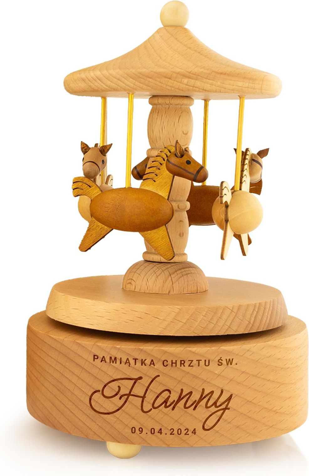 Pamiątka Chrztu Świętego GRAWER drewniana pozytywka KARUZELA na CHRZEST Elegancka pozytywka z konikami + GRAWER DEDYKACJI Prezent na Chrzest Święty dla chłopca, dziewczynki pozytywka karuzela z konikami materiał: lite drewno bukowe średnica: 11 cm wysokość: 17 cm mechanizm napędzany sprężyną …