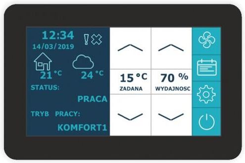Panel dotykowy PS-D6 współpracuje ze sterownikiem STW-6 stosowanym w rekuperatorach VENA. Zgrabna, elegancka obudowa daje szerokie możliwości aranżacji i sprawia, że panel z powodzeniem sprawdzi się w każdym wnętrzu. Zalety paneli dotykowych PS-D6: intuicyjny, przyjazny interface kolorowy wyświetlacz 4.3" nowoczesny minimalistyczny design wbudowany czujnik temperatury (pokojowy) montaż natynkowy Wymiar (wys. x szer. x gr.): 120 x 80 x 22,5 mm* *w zależności od wersji może wystąpić różnica w szerokości i wysokości panelu +10 mm