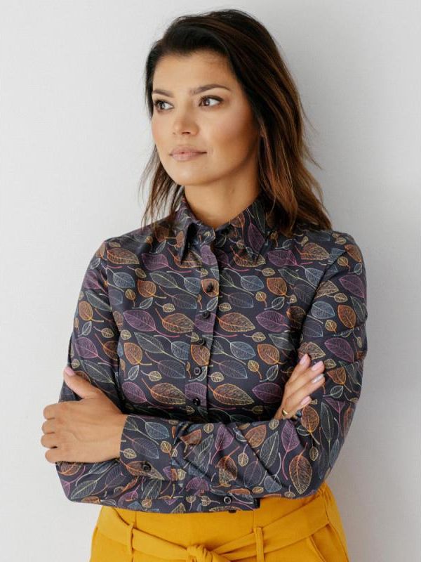 Czarna, taliowana koszula damska w kolorowe jesienne liście z krytym podpinanym kołnierzykiem, tkanina z dodatkiem elastanu