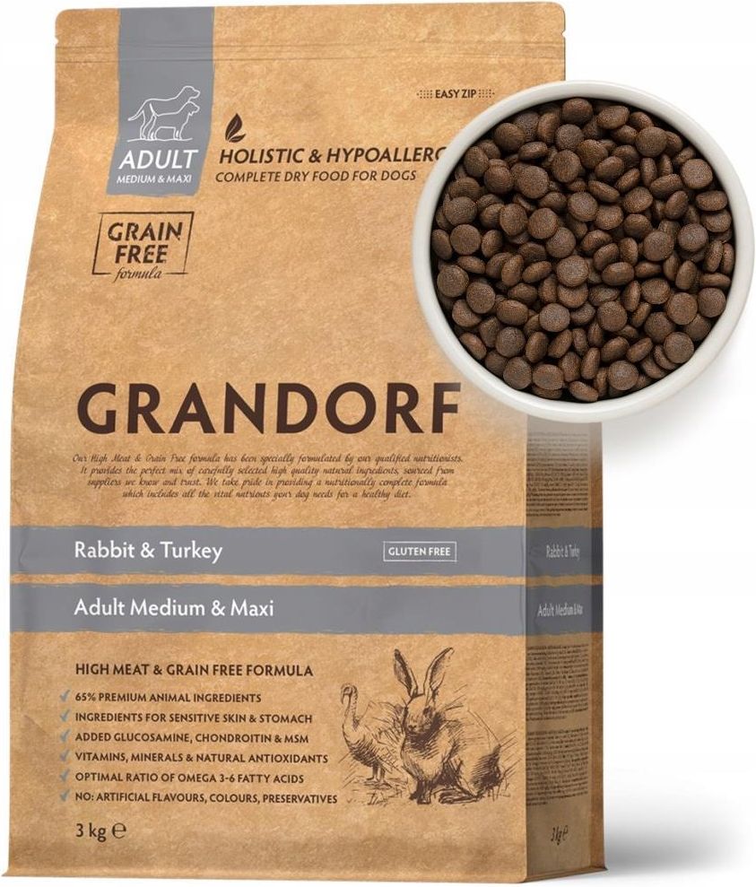 GRANDORF RABBIT TURKEY MEDIUM MAXI ADULT, KRÓLIK INDYK KARMA DLA PSA 3kg Dla dorosłych psów ras średnich i dużych 65% mięsa i składników pochodzenia zwierzęcego - bez produktów ubocznych Hipoalergiczne składniki Wysoka wartość odżywcza Bez kurczaka, pszenicy, soli, cukru, barwników, aromatów, soi i …