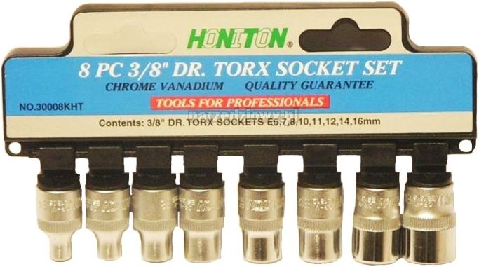 ZESTAW KLUCZY NASADOWYCH TORX 3/8" - 8 ELEMENTÓW E6-E16MM. FIRMY HONITON NUMET KATALOGOWY H3008 Klucze wykonane ze stali chromowo-wanadowej. W zestawie nasadki TORX: E6; E7; E8; E10; E11; E12; E14; E16. Opakowanie: plastikowa zawieszka