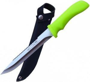 8187 nóż wędkarski firmy KDS Sedlčany ostrze 165 mm, długość całkowita 283 mm, waga 97 g Wysokiej jakości nóż wędkarski z ostrzem ze stali nierdzewnej. Rączka dobrze leży w dłoni, a dzięki charakterystycznemu kolorowi jest zauważalna na trawie. Nóż ma ostry czubek i dwa ostrza. Na górnej krawędzi znajduje się ząbkowane ostrze do łatwego usuwania łusek z ryb. Dolne ostrze jest gładkie do normalnego cięcia. W komplecie etui ze sztucznej skóry.