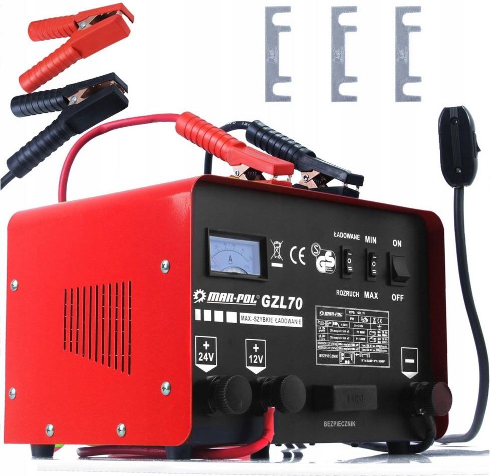 ZESPÓŁ PROSTOWNIKOWY GZL-70 M-P MAR-POL M82508 Uniwersalny prostownik samochodowy GZL-70 FAST CHARGE + ROZRUCH Ładuj akumulatory 12V oraz 24V o Dlaczego warto wybrać prostownik GZL-70 ? funkcja FAST CHARGE ( szybkie ładowanie ) FUNKCJA WSPOMAGANIA ROZRUCHU Z PILOTA uniwersalność użytkowania szczytowy prąd ładowania 60A ładowanie i rozruch akumulatorów 12V oraz 24V prosta i intuicyjna obsługa zapasowe bezpieczniki 2 FUNKCJA AUTO Niezwykle solidna i przemyślana konstrukcja, wyposażony w termiczny wyłącznik zabezpieczający przed uszkodzeniem, który rozłącza układ gdy przegrzeje się transformator i ponownie załącza po jego ostygnięciu. ROZRUCH STEROWANY Z PILOTA Prostownik posiada funkcję wspomagania rozruchu START, wystarczy ustawić prostownik na pozycję ROZRUCH i sterować pilotem wyposażonym w przełącznik na długim przewodzie. Szczytowy prąd rozruchu: 200A Rozruch do pojazdów/maszyn/urzadzeń wyposażonych w akumulatory 12V jak i 24!!! INTUICYJNY PANEL STEROWANIA Niezwykle prosty w użytkowaniu nawet dla początkującej osoby !!! 1. Wystarczy wybrać tryb 12 /24 V 2. Oraz sposób ładowania MIN - ładowanie normalne MAX. - FAST CHARGE ( ładowanie szybkie ) 3. Pozwolić naładować się akumulatorowi Funkcja FAST CHARGE ( szybkie ładowanie ) Prostownik GZL-70 został wyposażony w funkcję FAST CHARGE, która pozwala na jeszcze szybsze ładowania akumulatora, co przyda się szczególnie w nagłej potrzebie szybkiego naładowania akumulatora Długie okablowanie, około 3 metry Masz daleko gniazdko od samochodu? Krótki przedłużacz? Nie musisz się martwić ponieważ nasz prostownik jest wyposażony w długie solidne kable o łącznej długości około 3 metrów! licząc razem z kablem zasilającym. ( licząc od gniazdka do żabki ) Osprzęt wysokiej jakości Praca z prostownikiem wymaga uwagi, dlatego aby zmaksymalizować bezpieczeństwo pracy prostownik został wyposażony w specjalnie zabezpieczone grubą warstwą gumy zaciski ( krokodylki ) Prostownik został wyposażony w intuicyjny w obsłudze pilot do sterowania rozruchem Prostownik posiada bezpieczniki, jeden zamontowany i 2 zapasowe Przemyślana konstrukcja zapewniająca efektywne chłodzenie Efektywne odprowadzanie ciepła jest bardzo ważne ze względu na nagrzewanie się prostowników podczas ładowania co może spowodować zapłon. Obudowa prostownika GZL-70 jest w pełni metalowa w przeciwieństwie do tańszych zamienników wykonanych z plastiku, co zapobiega topieniu się materiału przy wysokiej temperaturze Obudowa została zaprojektowana tak aby efektywnie odprowadzać ciepło , zastosowano duzą ilość kanałów odprowadzających ciepło Praktyczne rozwiązania ułatwiające codzienną pracę Prostownik został wyposażony w niezwykle przydatną rączkę za pomocą której możemy przenosić prostownik i ustawić go w dowolnym miejscu bez ryzyka ( poparzenia się, ubrudzenia , upuszczenia ) Parametry techniczne Napięcie zasilające: 230V 50Hz Napięcie ładowania: 12V / 24V Prąd znamionowy wyjściowy: 30A Prąd rozruchu: 180A W ZESTAWIE Prostownik GZL-70 pilot sterowania zapasowe bezpieczniki Oryginalne opakowanie producenta Instrukcja obsługi