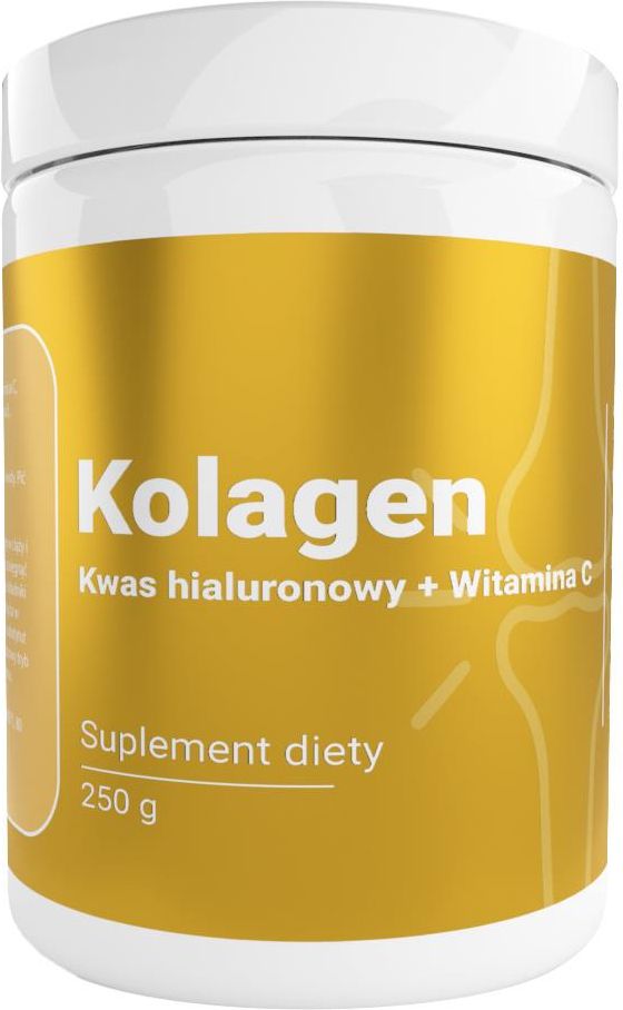 Kolagen z kwasem hialuronowym i witaminą C zawiera połączenie kolagenu wołowego, kwasu hialuronowego i witaminy C. Regularne stosowanie tej kombinacji wspomaga uzyskanie gładkiej, elastycznej i dobrze nawilżonej skóry, a także wspiera produkcję chrząstek i kości. Proszek łatwo rozpuszcza się w szklance wody, oferując orzeźwiający napój o smaku pomarańczy. Preparat jest bez dodatku cukru, słodzony sukralozą. Główne składniki: Kolagen to podstawowy budulec tkanek łącznych, wspierający elastyczność i jędrność skóry. Witamina C przyczynia się do prawidłowej produkcji kolagenu, co wspomaga zdrowie naszych kości, skóry, chrząstek, naczyń krwionośnych, zębów i dziąseł. Dodatkowo chroni komórki przed stresem oksydacyjnym i wspiera właściwe funkcjonowanie układu odpornościowego. Kwas hialuronowy jest składnikiem tkanki łącznej i skóry, stanowi jedno z głównych składników substancji międzykomórkowej, zdolny do wiązania dużej ilości wody i zapewniający głębokie nawilżenie i elastyczność skóry.
