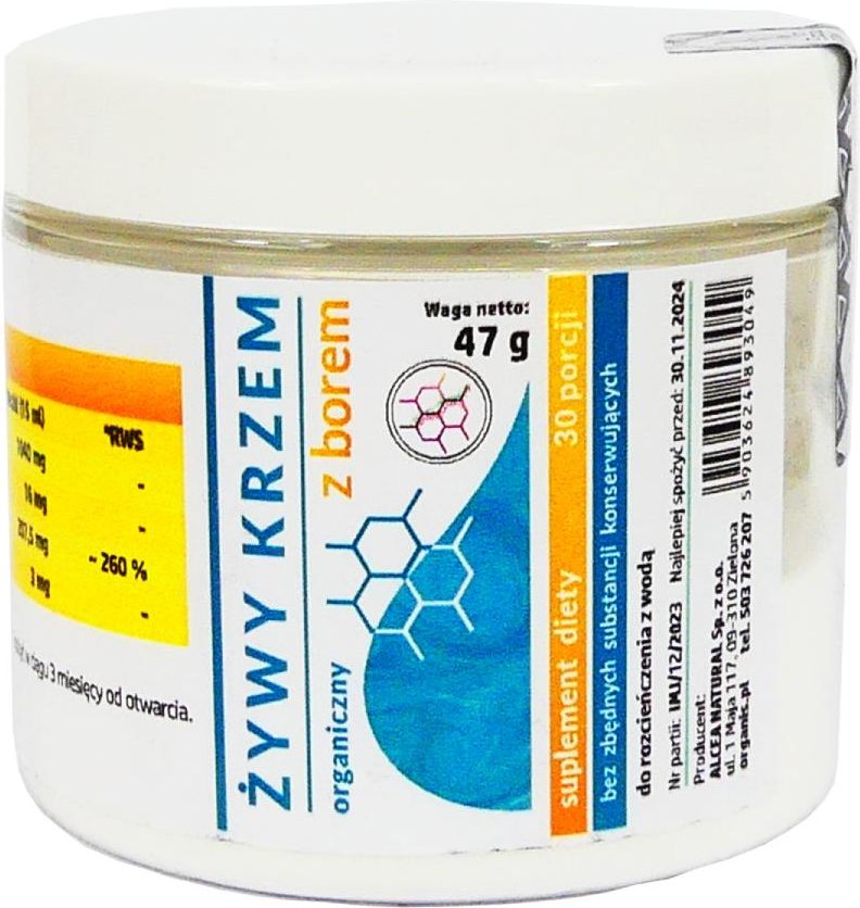 Składniki: Woda oczyszczona, kwas ortokrzemowy, witamina C (kwas L-askorbinowy), bor (boran sodu), benzoesan sodu (E211). 3 łyżeczki zawierają (15 ml) / *RWS: krzem organiczny (kwas ortokrzemowy) - 390 mg, witamina C (kwas askorbinowy) - 150 mg / 187,5 %, bor (boran sodu) - 3 mg. *RWS – referencyjna wartość spożycia. Masa netto: 47 g Właściwości: Krzem stanowi element budulcowy kości, odpowiada za ich wzrost, wapnienia oraz mineralizację. Przyczynia się do zagęszczenia struktury szkieletu, dzięki czemu wspomaga on leczenie osteoporozy. Pozytywnie działa on też na kondycję skóry, włosów oraz paznokci. Bor wpływa na prawidłowy metabolizm witaminy D. Dzięki niemu witaminy i pierwiastki takie jak wapń są w stanie utrzymać się na właściwym poziomie oraz dużo lepiej się wchłaniają. Bor dodatkowo wzmacnia i buduje mięśnie. Zalecane dzienne spożycie: Spożywaj przy użyciu dołączonej płaskiej łyżeczki (2 ml) rozcieńczonej w 1/2 szklanki letniej wody. Wymieszaj i wypij. Stosuj 2-3 razy dziennie. Przeciwwskazania: Alergia na którykolwiek ze składników. Nie stosować z innymi preparatami zawierającymi krzem. Odradza się stosowanie w ciąży, podczas karmienia piersią i u dzieci. Przechowywanie: Przechowywać w zamkniętym opakowaniu, w temp. do 30°C, w sposób niedostępny dla małych dzieci. Po otwarciu przechowywać w lodówce. Spożyć w ciągu 2 miesięcy. Producent: ALCEA NATURAL SP. Z O.O. ul. 1 Maja 117 09-310 Zielona