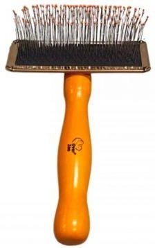 Over Zoo Szczotka z Długami Igłami i Kulkami Rozmiar L Dzięki stalowym, lekko wygiętym igłom doskonale sprawdza się do rozczesywania splątanej sierści, kołtunów oraz wyczesywania martwego podszerstka. Gumowa poduszka amortyzuje nacisk dzięki czemu szczotka lepiej rozczesuje włos i nie podrażnia skóry zwierzęcia. Plastikowe kulki na końcach igieł zabezpieczają dodatkowo przed podrażnieniem skóry. Ergonomiczny, drewniany uchwyt ułatwia rozczesywanie. Główne zalety produktu: Igły ze stali nierdzewnej z plastikowymi kulkami Gumowa poduszka Drewniany uchwyt o ergonomicznym kształcie