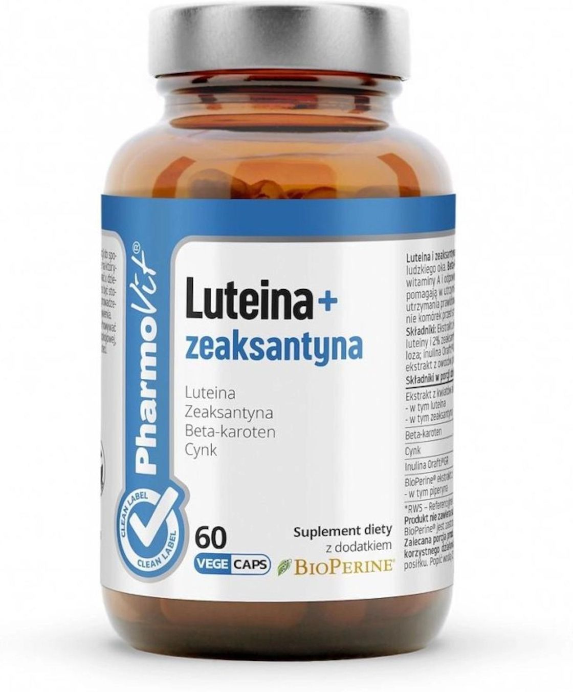 LUTEINA + ZEAKSANTYNA BEZGLUTENOWA 60 KAPSUŁEK - PHARMOVIT (CLEAN LABEL) PHARMOVIT (suplementy diety) SKŁADNIKI Ekstrakt z kwiatów aksamitki wzniesionej standaryzowany na 20 % luteiny i 2 % zeaksantyny; kapsułka celulozowa: hydroksypropylometyloceluloza; inulina Orafti®GR; beta-karoten; cynk …