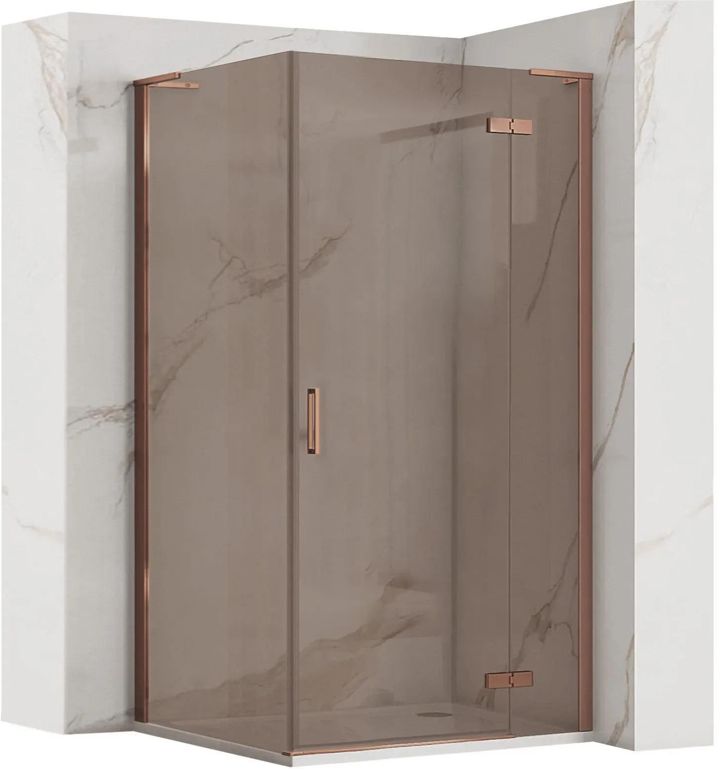 Kabina prysznicowa Hugo narożna to eleganckie i praktyczne rozwiązanie stworzone z myślą o nowoczesnych łazienkach. Składa się z drzwi otwieranych na zawiasach oraz bocznej ścianki stałej. Hartowane, przydymione szkło w odcieniu brązowym połączone z profilami wykonanymi z wytrzymałego aluminium w kolorze miedzi szczotkowanej tworzy efektowną i trwałą całość. Zastosowana powłoka Easy Clean ułatwia czyszczenie powierzchni i chroni szkło przed osadzaniem się kamienia oraz smug. Solidne zawiasy gwarantują płynne i stabilne otwieranie drzwi, a ergonomiczny uchwyt podkreśla nowoczesny styl kabiny. Model ten można zamontować zarówno na klasycznym brodziku, jak i bezpośrednio na posadzce, co daje pełną swobodę w dopasowaniu do stylu i układu łazienki. To rozwiązanie, które łączy estetykę z codziennym komfortem użytkowania.