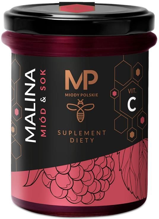 Miody Polskie Miód & Sok Malina + Vit. C 250 g to suplement diety, który łączy w sobie miód z sokiem malinowym. Wzbogacono go o witaminę C, która pomaga we wzmocnieniu systemu odpornościowego organizmu.