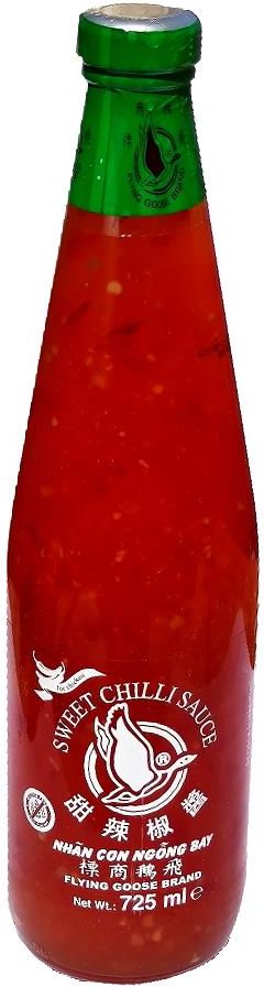 Tajski Duży Słodki Sos Chili Do Kurczaka Sweet Chilli Dip For Chicken 725ml FLYING GOOSE BRAND Opis: Gęsty, słodki sos chili do kurczaka firmy Flying Goose Brand w butelce 740ml. W środku widać kawałki chili oraz nasiona chili. Sos można dodać do potraw smażonych w woku, jako dip np. sajgonek, praktycznie do wszystkiego. Składniki: Cukier, woda, chili 22%, czosnek, sól, ocet destylowany, skrobia z tapioki, regulator kwasowości E330, E260, stabilizator E415. Produkcja: Tajlandia Informacje dodatkowe: Produkt może zawierać śladowe ilości pszenicy, ryb, orzechów ziemnych, soi i sezamu - informacja dla alergików. Wartości odżywcze w 100ml produktu Wartość energetyczna: 931kJ/219kcal, Tłuszcz <0,5g, w tym kwasy tłuszczowe nasycone <0,1g, Węglowodany 53g, w tym cukry 46g, Białko 1,4g, Sól 3,5g. Masa netto: 740ml Sposób przechowywania: Przechowywać w suchym i chłodnym miejscu, po otwarciu w lodówce, maksymalnie do ośmiu tygodni. Tajski Duży Słodki Sos Chili Do Kurczaka Sweet Chilli Dip For Chicken 725ml FLYING GOOSE BRAND