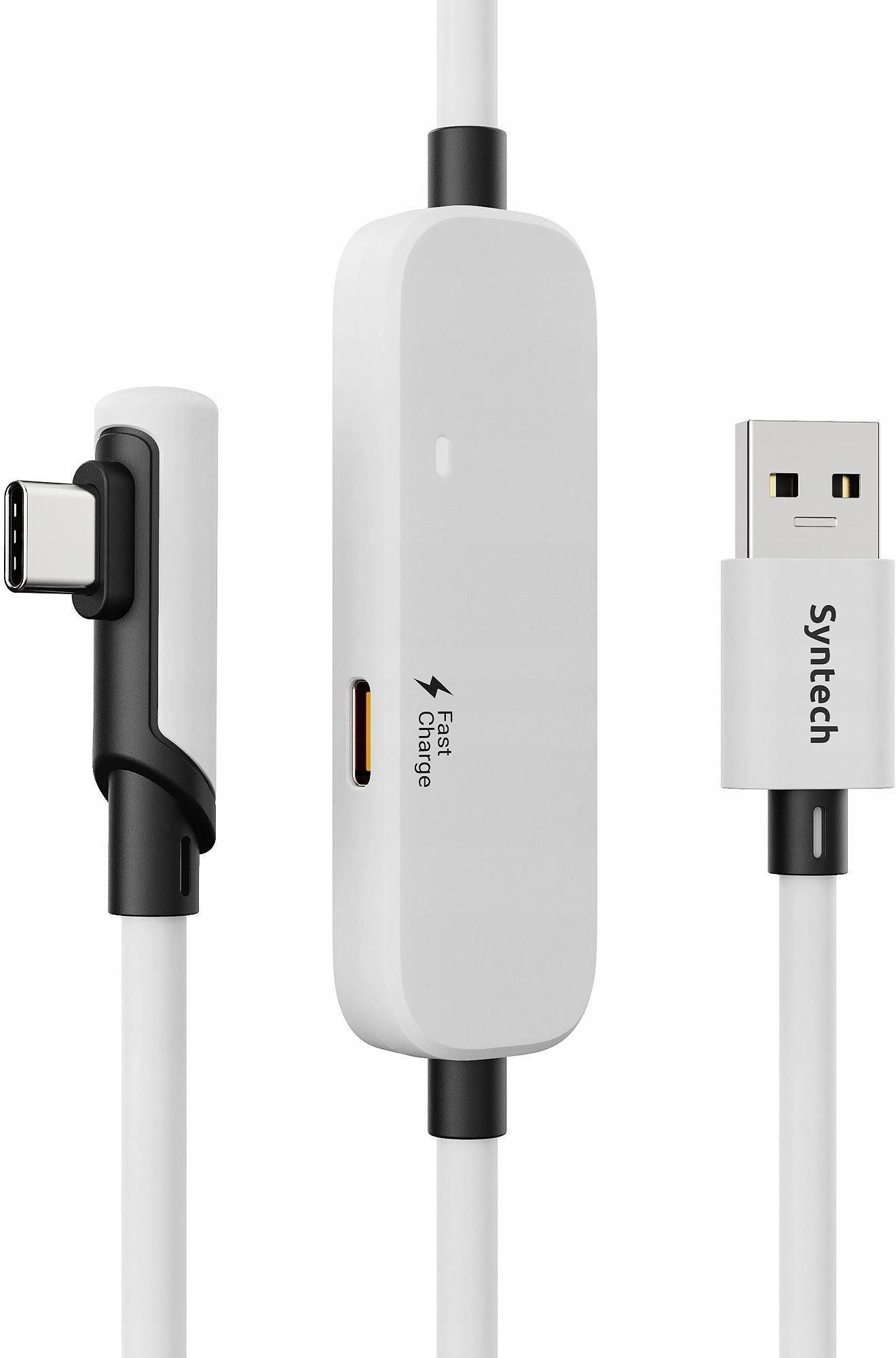 Kabel do ładowania oraz transmisji danych / Długość: 5m ✅ Kolor: biało-czarny ?Wysokiej jakości kabel USB o długości 5 metrów, przeznaczony do połączenia gogli VR z urządzeniami zewnętrznymi takimi jak konsola czy komputer oraz dodatkowo do ładowania tych urządzeń. ?Kabel gwarantuje nie tylko szybki i stabilny transfer danych oraz ładowanie, ale także wyjątkowo płynne doświadczenie podczas grania i oglądania filmów dzięki wtykowi USB 3.0 z przepustowością do 5 Gbps i 120 Hz. Długość kabla: 5 m (16 ft) – pełna swoboda ruchu Szybki transfer danych: USB 3.0 z przepustowością do 5 Gbps / 120 Hz dla płynnej transmisji obrazu i dźwięku Możliwość szybkiego ładowania gogli VR Dodatkowy port wejściowy USB-C / USB TYPE-C FAST CHARGING - do szybkiego ładowania - port pozwala podłączyć zewnętrzne źródło Wysokiej jakości materiały: PVC, ABS, miedź Idealny do długich sesji VR i gier na PC Produkt firmy Syntech Kolor: Biały Model: M32C1-5 Kompatybilność Kabel Syntech Fast Charging Link Cable jest w pełni kompatybilny z popularnymi goglami VR, takimi jak: Oculus Meta Quest 2 Oculus Meta Quest 3 Oculus Meta Quest 3S Pico 4 Pico 4 Ultra Działa bez problemu z komputerami PC wyposażonymi w porty USB 3.0, umożliwiając płynną rozgrywkę na platformach takich jak SteamVR czy PC VR. Szybkie ładowanie Dodatkowy port wejściowy USB-C / USB TYPE-C FAST CHARGING pozwala na podłączenie urządzenia zewnętrznego - ładowarki i szybkie ładowanie urządzeń podłączonych do kabla, np. gogli VR lub każdego innego urządzenia z portem wejściowym USB-C / USB TYPE-C lub USB / USB-A Zalety Wtyk USB 3.0 z przepustowością do 5 Gbps / 120 Hz dla płynnej transmisji danych Osobny port ładowania dla szybkiego ładowania (18W / 9V 2A) Szybsze ładowanie niż przy pomocy standardowych kabli Długość 5 m dla pełnej swobody ruchu Wysokiej jakości materiały: PVC, ABS, miedź Uniwersalny kabel kompatybilny z najpopularniejszymi goglami VR Dane techniczne Przepustowość portu USB 3.0: 5 Gbps / 120 Hz Szybkie ładowanie: 18W / 9V 2A Długość kabla: 5 m Materiały: PVC, ABS, miedź Złącza: USB-A / USB 3.0 (męskie) USB-C / USB Type-C (męskie) USB-C / USB Type-C Fast Charging (żeńskie)