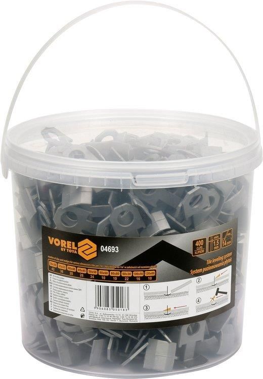System, klipsy do poziomowania płytek 1mm, 400szt. w wiaderku Nowoczesny system do poziomowania płytek, który w bardzo szybki i łatwy sposób pomaga ułożyć idealnie płytki oszczędzając czas i eliminując niedokładności powierzchni. Zawartość opakowania klipsy - 400 sztuk Dodatkowe informacje Przeznaczony do płytek ceramicznych, gresowych, rektyfikowanych podłogowych i ściennych o różnych rozmiarach i grubościach. Minimalna grubość fugi przy układaniu płytek to 1 mm, używając jednocześnie krzyżyki dystansowe, możemy uzyskać oczekiwaną szerokość. Grubość płytek, przy jakiej można stosować system: 7 - 14 mm Sposób użycia Po nałożeniu kleju włóż klipsy pod kafel tak, aby z każdej strony płytki znalazły się po 2 klipsy Dosuń kolejną płytkę do klipsów Wsuń klin i dociśnij aby wyrównać kafelki względem siebie. Po zastygnięciu zaprawy (kleju) do glazury, usuwamy klips lekko go uderzając. Zalety stosowania systemu VOREL stabilizuje położenie uzyskuje się równą powierzchnię bez nadmiernie powtarzającego się poziomowania nie ma potrzeby używania dodatkowych narzędzi, nie wymaga wysiłku - jest łatwy w montażu na każdym poziomie umiejętności. zapobiega przemieszczaniu podczas instalacji i wiązania kleju. przyśpiesza układanie płytek z zachowaniem idealnych fug i połączeń. można go stosować na ściany i podłogi. proponowany osobom zawodowo układającym kafelki, jak i tym bez doświadczenia. Ilość klinów i klipsów na 1m2 w zależności od rozmiaru płytki 30 cm x 30 cm - 42 szt 33 cm x 33 cm - 36 szt 40 cm x 40 cm - 20 szt 45 cm x 45 cm - 28 szt 50 cm x 50 cm - 24 szt 60 cm x 60 cm - 10 szt 80 cm x 80 cm - 10 szt 60 cm x 30 cm - 22 szt 100 cm x 50 cm - 16 szt 120 cm x 60 cm - 10 szt AR9GWE04717MK3S