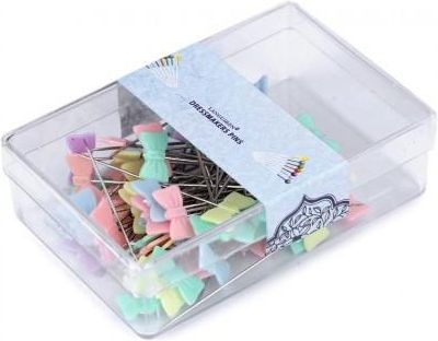 Dekoracyjne szpilki mają główki w kształcie kokardek w różnych kolorach. Mogą służyć w krawiectwie, a także np. do ozdobnego mocowania dekoracji. Wymiary: Długość: 41 mm, średnica drutu: 0,6 mm Zawartość opakowania: ok. 80 szt.