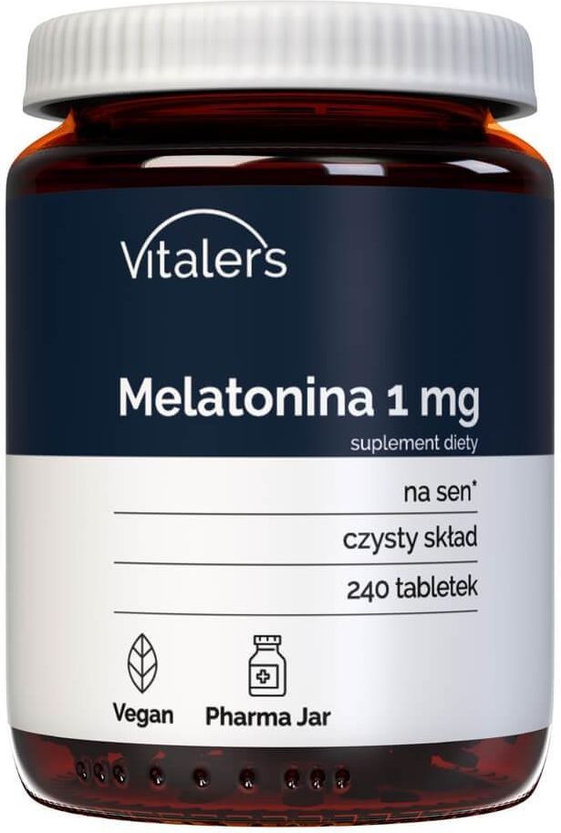 Melatonina marki Vitaler's to suplement diety w tabletkach zawierający melatoninę. Melatonina pomaga w skróceniu czasu potrzebnego na zaśnięcie oraz w łagodzeniu subiektywnego odczucia zespołu nagłej zmiany strefy czasowej. Zażywanie melatoniny jest uznawane jako jeden z najskuteczniejszych sposobów walki z bezsennością i ogólnymi problemami ze snem. Zachowanie odpowiedniego rytmu biologicznego jest niezwykle ważne dla prawidłowego funkcjonowania. Oprócz oczywistego działania melatoniny na sen, wykazuje także szereg innych zastosować, które okazują się zbawienne dla organizmu. Melatonina – charakterystyka Melatonina często nazywana jest także jako „hormon ciemności” lub „hormon snu”. Produkowana jest głównie w szyszynce, czyli gruczole znajdującym się w głębi mózgu, a zwiększone stężenie osiąga wraz z upływem dnia – im później, tym większy poziom melatoniny w organizmie. Najwyższe stężenie melatoniny osiągane jest w nocy, najczęściej od północy do 3 nad ranem. Dodatkowo melatonina „reaguje” na porę roku, ze względu na długość oświetlenia. Melatonina jest najważniejsza w regulowaniu ludzkiego zegara biologicznego. To jej aktualny poziom w organizmie wpływa na poczucie senności. Co ciekawe, melatonina jest także wytwarzana w oczach (w siatkówce oka) oraz w szpiku i jelitach, niezależnie od pory dnia. Melatonina w układzie pokarmowym kieruje ruchami jelit. Właściwości melatoniny Melatonina reguluje dobowy cykl organizmu na podstawie sygnałów odbieranych z oczu, które następnie przesyła do mózgu. Siatkówka oka odbiera światło – sztuczne oraz naturalne, a także sztuczne bodźce świetlne (telewizory, telefony, lampy czy żarówki). Melatonina, która powstała w siatkówce oka wysyła sygnał do mózgu, co w ostateczności decyduje o poziomie senności. Melatonina znajduje swoje zastosowanie w leczeniu bezsenności przewlekłej, za którą odpowiedzialny jest rozregulowany dobowy cykl dnia. Wówczas jej działanie polega na ujednoliceniu procesów zachodzących w organizmie człowieka, a co za tym idzie, wypracowanie regularnych cyklów dobowych. Aby działanie melatoniny było skuteczne, należy precyzyjnie ustalić, o której godzinie suplement z melatoniną będzie przyjmowany. Melatonina – suplementowanie Melatonina to hormon, który jest naturalnie wytwarzany w organizmie człowieka. Zaburzenia jego wydzielania lub całkowity brak prowadzi do poważnych zaburzeń snu, a ostatecznie także do bezsenności. Zaburzenia snu to wynik niezgodności między naturalnym rytmem dobowym organizmu a tym, który narzuca prowadzony styl życia. Na rozregulowanie dobowego rytmu dnia może mieć wpływ praca na nocne zmiany lub nauka do późnych godzin. Osoby z zaburzeniami snu odczuwają zmęczenie dopiero w późnych godzinach nocnych, co skutecznie wpływa na jakość snu i rozdrażnienie. Zaburzenia snu przekładają się na problemy z koncentracją, zmęczenie w ciągu dnia, oraz ogólne złe samopoczucie. Aby przywrócić regularność dobowego cyklu, można sięgnąć po suplement diety zawierający odpowiednią dawkę melatoniny. Na rynku dostępnych jest wiele suplementów pomagających w zasypianiu. Można wybierać spośród ziołowych suplementów, które zawierają melatoninę połączoną z innymi składnikami pochodzenia naturalnego oraz preparatów, które zawierają w składzie czystą melatoninę. Dlaczego warto wybrać Vitaler's? Vitaler’s jest rodzimą marką, która bazuje wyłącznie na naturalnych składnikach, ciemne opakowanie chroni produkt przed promieniowaniem UV i utraceniem dobroczynnych właściwości, Vitaler’s dokładnie kontroluje każdy etap produkcji, ponieważ swoje produkty wytwarza na własnej linii produkcyjnej, składy produktów są całkowicie czyste – bez konserwantów, parabenów i innych, dawka melatoniny w produkcie jest idealnie dostosowana do potrzeb każdego z nas Produkcja i standardy jakości Melatonmina od Vitaler’s jest wytwarzana zgodnie ze standardami jakości GMP i HACCP. Znaczy to, że podczas jej produkcji zachowano najwyższe normy jakości i technologiczne. GMP i HACCP są zespołem dobrych praktyk, które mają na celu zapewnienie bezpieczeństwa i wygody zarówno pracownikowi, jak i konsumentowi. Audyty związane z GMP i HACCP obejmują: ścisłą kontrolę procesu produkcyjnego i całego zakładu, pobieranie i badanie mikrobiologiczne próbek produktów, porównywanie preparatów z różnych partii i ich zgodności z pierwszą próbką, sprawdzanie stanu technicznego budynku i zdrowia pracowników, prowadzenie bardzo dokładnej dokumentacji związanej z wytwarzaniem preparatu. Skład Wielkość opakowania: 240 tabletek Porcja jednorazowa: 1 tabletka Ilość porcji w opakowaniu: 240 Składniki1 tabletkaRWSMelatonina1 mg RWS - Dzienna referencyjna wartość spożycia Nie ustalono dziennej referencyjnej wartości spożycia Składniki: Substancja wypełniająca: celuloza mikrokrystaliczna; melatonina. Sposób użycia: 1 tabletka krótko przed pójściem spać. Przeciwwskazania: Nadwrażliwość na którykolwiek ze składników preparatu. W okresie ciąży i karmienia piersią przed zastosowaniem należy skonsultować się z lekarzem lub farmaceutą. Przechowywanie: Przechowywać w suchym i ciemnym miejscu, w temperaturze 0-25ºC, w sposób niedostępny dla małych dzieci. Ważne: Produkt nie może być stosowany jako substytut (zamiennik) prawidłowo zróżnicowanej diety. Zrównoważony sposób żywienia i prawidłowy tryb życia jest ważny dla funkcjonowania organizmu człowieka. Nie należy przekraczać maksymalnej zalecanej porcji do spożycia w ciągu dnia.