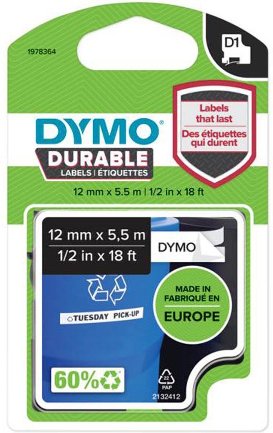 Taśma DYMO Durable D1-1978364 12 mm x 5,5 m / do drukarek DYMO D1 Taśmy Durable mają lepszą przyczepność niż standardowe taśmy D1, dzięki temu można umieszczać je również na chropowatych powierzchniach nawet na zewnątrz budynków. Kolor taśmy: biały, materiał: winyl, klej: trwały. W przypadku trudnych powierzchni używaj właśnie taśm Dymo D1 Durable, które są twardsze i wytrwają dłużej niż taśmy papierowe. Charakteryzują się odpornością przemysłową i odpornością na blaknięcie, złuszczanie i ścieranie z powodu światła, ciepła, wilgoci i domowych środków czyszczących. Najważniejsze zalety taśmy Dymo D1 Durable: Klej o wysokiej wytrzymałości pomaga zagwarantować, że taśmy przykleją się do różnych powierzchni Odporny na zarysowania i rozdarcia materiał zapewnia czytelność tekstu Taśmy są idealne do kubków, butelek z wodą i pojemników do przechowywania żywności Idealny do etykietowania kuchni, spiżarni, szafek narzędziowych, pralni, warsztatów lub garażu Do użytku wewnątrz / na zewnątrz Wodoodporna konstrukcja odporna na promieniowanie UV, ciepło, wilgoć, środki do czyszczenia i prawie w warunkach zamrażania Taśmy Dymo D1 Durable o wymiarach 12 mm na 5,5 m możesz stosować w następujących drukarkach Dymo: Seria drukarek Label Manager: Label Manager PnP, Label Manager 160, Label Manager 220P, Label Manager 210D, Label Manager 260P, Label Manager 360D, Label Manager 420P, Label Manager 450D Seria drukarek Label Point: Label Point 100, Label Point 200, Label Point 250, Label Point 300, Label Point 350 Drukarka Label Writer 450 Duo Drukarki przemysłowe typu Rhino
