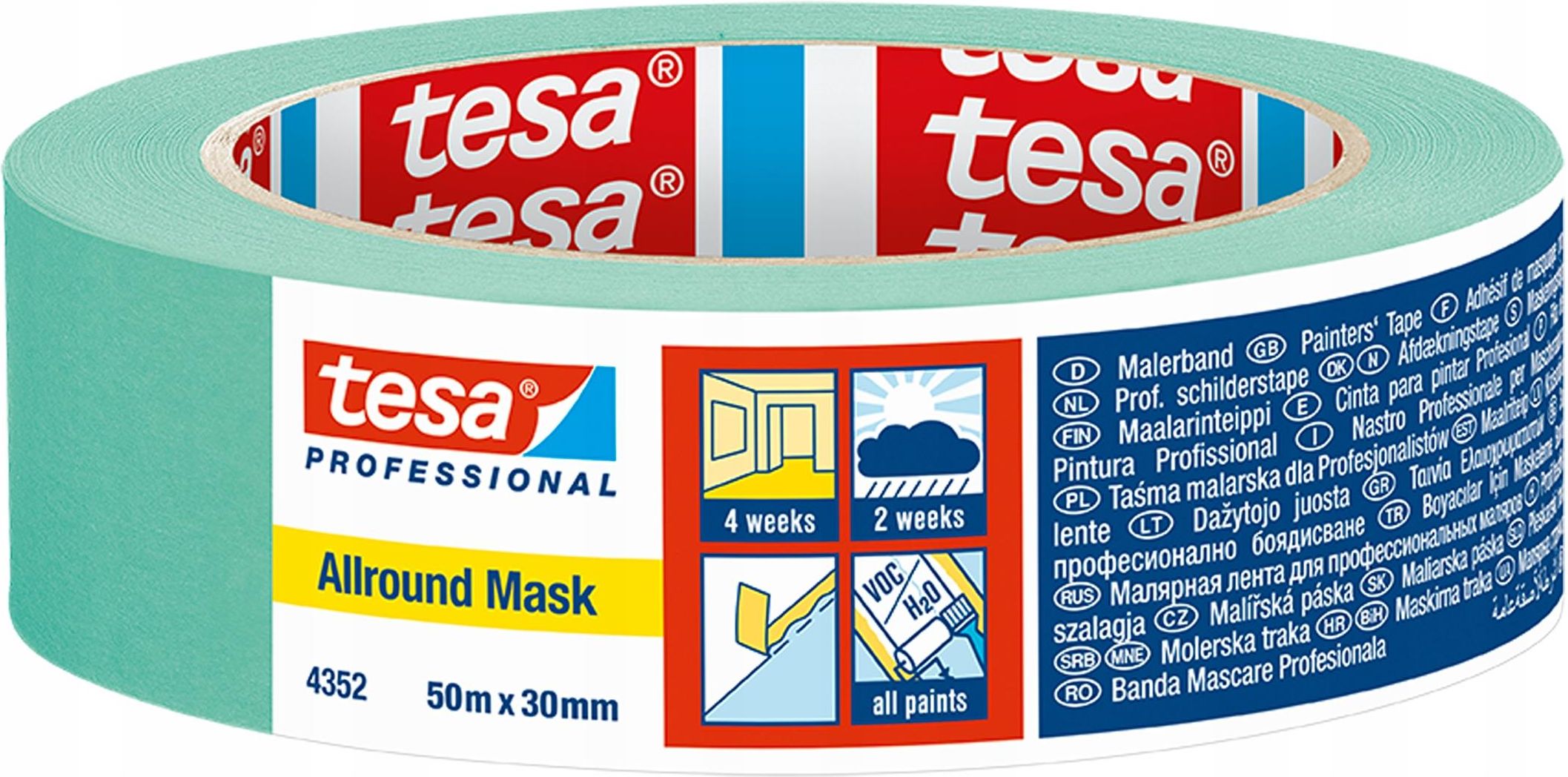 Taśma malarska tesa® Professional Allround Mask 50m x 30mm, zielona Jeśli poszukujesz doskonałego narzędzia, które pomoże Ci osiągnąć ostre i precyzyjne krawędzie malarskie, to tesa® 4352 Allround Mask to rozwiązanie, którego potrzebujesz. Ta wysokiej jakości taśma maskująca jest idealna do użytku zarówno wewnątrz, jak i na zewnątrz pomieszczeń, oferując niezawodne rezultaty malarskie, bez względu na warunki. Ostre krawędzie Gładki podkład papierowy, na którym opiera się tesa® 4352, gwarantuje, że każda krawędź farby będzie ostro odcięta, bez żadnych niepożądanych zacieków. Dzięki temu Twoje prace malarskie będą wyglądać profesjonalnie i zadowolą nawet najbardziej wymagających klientów. Doskonała przyczepność i odporna na rozdarcia Jednym z kluczowych atutów tej taśmy jest doskonała przyczepność, zarówno do gładkich, jak i lekko teksturowanych powierzchni. Niezależnie od tego, czy pracujesz z farbami, glazurami czy lakierami, tesa® 4352 Allround Mask doskonale dostosowuje się do różnych materiałów, gwarantując bezproblemowe malowanie. Co więcej, nasza taśma maskująca jest wyjątkowo wygodna w użyciu i odporna na rozdarcie. Dzięki temu możesz skupić się na swojej pracy, zamiast martwić się o ewentualne problemy z narzędziami. Usuwanie bez śladu Najważniejszą cechą tesa® 4352 Allround Mask jest możliwość jej usunięcia bez pozostawiania śladów kleju. Wewnątrz pomieszczeń możesz to zrobić nawet po miesiącu, a na zewnątrz po dwóch tygodniach. To oznacza, że Twoje prace malarskie będą zawsze prezentować się perfekcyjnie, bez śladu po taśmie.