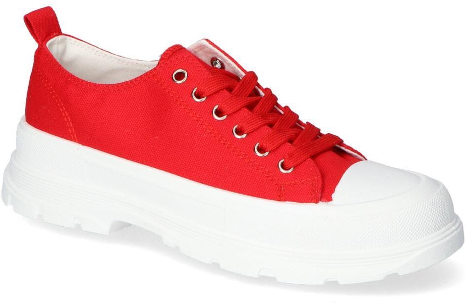 Wygodne trampki damskie:- cholewka wykonana została z materiału tekstylnego - wnętrze pokryte zostało materiałem tekstylnym aby zapewnić komfort podczas użytkowania - sznurowadła ułatwiają zakładanie oraz dopasowanie obuwia - podeszwa o grubości 2,5 cm zapewnia stabilizację - czerwony kolor w połączeniu z białym kolorem oraz modny fason tworzą efekt, który zachwyci każdą kobietę!