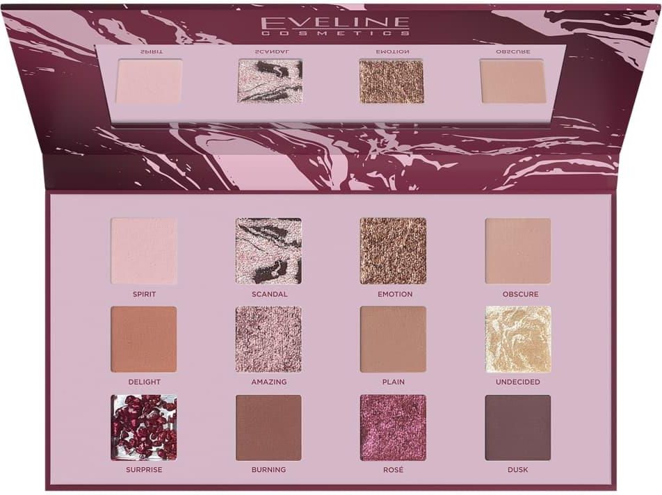 Eveline Paleta Cieni Shocking Nudes W przyciągającym spojrzenie, kartonowym opakowaniu z lusterkiem znajdziesz: 6 aksamitnie miękkich, silnie napigmentowanych matów,  3 połyskujące cienie metaliczne, 2 kremowe, mieniące się cienie marmurkowe i naszą niespodziankę… cień hybrydowy z kapsułkami w jagodowo-brązowym kolorze.  Uniwersalna i zawsze modna kolorystyka cieni pozwala stworzyć zarówno delikatniejszy, dzienny makijaż jak i wieczorowy, intensywnie połyskujący look na specjalne okazje.  Intensywna pigmentacja  Bezproblemowa aplikacja i blendowanie  Zróżnicowane wykończenia: matowe, metaliczne, marmurkowe, hybrydowy żel  Modna, uniwersalna kolorystyka  Trwałość na wiele godzin  Opakowanie z dużym lustrem  Wegańskie formuły  Cienie można nakładać palcami lub pędzelkiem z łatwością budując ich intensywność.