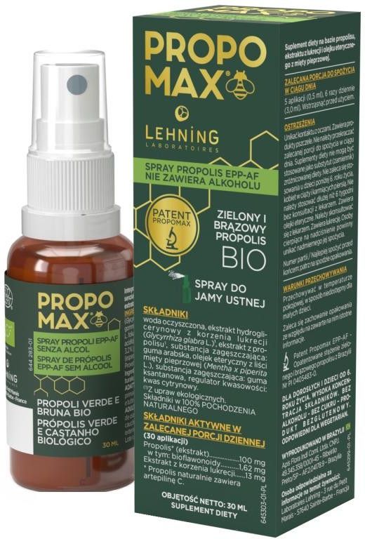 Lehning Propomax Brazylijski propolis zielony spray do jamy ustnej bez alkoholu 30 ml to suplement diety, który łączy w sobie opatentowany ekstrakt z propolisu, ekstrakt z lukrecji oraz olejek eteryczny pozyskiwany z liści mięty pieprzowej. Propolis jest ceniony za swoje właściwości wspierające prawidłowe funkcjonowanie górnych dróg oddechowych. Obecny w składzie ekstrakt z lukrecji wspomaga układ odpornościowy. Propomax spray z propolisem nie zawiera alkoholu ani cukru, jest bezglutenowy i odpowiedni dla wegetarian. Wygodna forma preparatu ułatwia aplikację i pozwala na użycie produktu zawsze wtedy, gdy zachodzi taka potrzeba. Lehning Propomax Brazylijski propolis zielony spray do jamy ustnej bez alkoholu 30 ml przeznaczony jest dla osób dorosłych i dzieci od 6. roku życia. Formuła została opracowana przez renomowaną firmę z Brazylii - Apis Flora Industrial e Comercial Ltda.