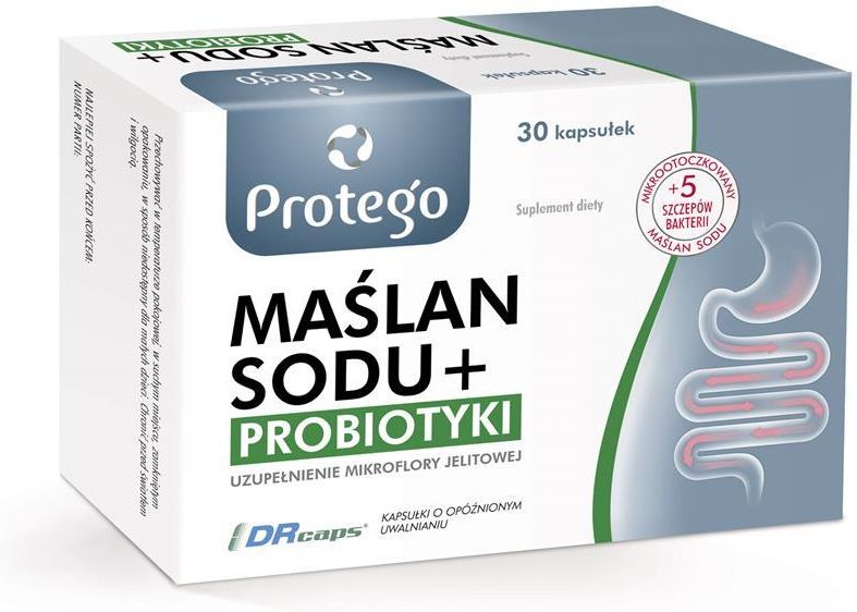 Salvum Lab Protego MAŚLAN SODU + PROBIOTYKI 5 szczepów bakterii 30 kapsułek Wspiera równowagę mikroflory jelitowej i funkcje układu trawiennego; Zawiera starannie dobrane szczepy bakterii probiotycznych; Technologia kapsułek z opóźnionym uwalnianiem DR CAPS; Idealny dla osób z wrażliwym przewodem pokarmowym; Praktyczne opakowanie 30 kapsułek. Protego Maślan Sodu+ probiotyki to zaawansowany suplement diety w formie kapsułek, który łączy dobroczynne działanie maślanu sodu z wyselekcjonowanymi kulturami bakterii probiotycznych, wspierając równowagę mikroflory jelitowej i prawidłowe funkcje układu pokarmowego. Produkt został zaprojektowany z myślą o osobach, które chcą zadbać o zdrowie jelit, szczególnie w sytuacjach obciążenia przewodu pokarmowego, po antybiotykoterapii lub przy wrażliwości układu trawiennego. Dzięki innowacyjnej technologii DR CAPS, kapsułki zapewniają opóźnione uwalnianie składników w jelitach, co sprzyja ich skuteczniejszemu działaniu tam, gdzie są najbardziej potrzebne. Produkt jest wygodny w codziennym stosowaniu i doskonale wpisuje się w codzienną rutynę osób dbających o zdrowie jelit oraz dobre samopoczucie Dla kogo jest ten produkt? Protego Maślan Sodu+ probiotyki to suplement diety szczególnie odpowiedni dla osób, które chcą zadbać o zdrowie jelit i komfort trawienia. Produkt może zainteresować: osoby z wrażliwym przewodem pokarmowym lub skłonnościami do dyskomfortu jelitowego; osoby po antybiotykoterapii, które chcą wspomóc odbudowę mikroflory jelitowej; osoby dbające o równowagę mikrobioty jelitowej jako element ogólnego zdrowia; osoby, które chcą wspierać prawidłowe funkcje trawienne w codziennej diecie. Dlaczego warto wybrać ten produkt? Wszechstronne wsparcie jelit: Połączenie maślanu sodu z probiotykami działa synergistycznie – maślan wspiera zdrowie nabłonka jelit, a probiotyki pomagają utrzymać równowagę mikroflory, co przekłada się na lepsze trawienie i komfort przewodu pokarmowego. Technologia opóźnionego uwalniania: Kapsułki DR CAPS zapewniają, że składniki są uwalniane tam, gdzie są najbardziej potrzebne – w jelitach, co może zwiększać ich efektywność. Przyjazny dla codziennego stosowania: Produkt jest łatwy do włączenia do codziennej rutyny zdrowotnej, co ułatwia regularne wspieranie mikroflory jelitowej. Zalecana dzienna porcja do spożycia: dorośli 1-2 kapsułki. Sposób spożycia: kapsułkę należy połknąć w całości (bez rozgryzania i bez wysypywania zawartości) popijając chłodną lub letnią wodą. Ostrzeżenia: Nie należy przekraczać zalecanej porcji w ciągu dnia. Nie należy stosować w przypadku nadwrażliwości na którykolwiek ze składników preparatu. Nie stosować w okresie ciąży i karmienia piersią. Suplement diety nie może być stosowany jako substytut (zamiennik) zróżnicowanej diety. Zrównoważony sposób żywienia i zdrowy tryb życia są ważne dla utrzymania prawidłowego stanu zdrowia. Składniki: maślan sodu (mikrootoczkowany), substancja wypełniająca: maltodekstryna; kapsułka (substancja wiążąca: hydroksypropylometyloceluloza); fruktooligosacharydy (FOS), Bifidobacterium lactis, substancja przeciwzbrylająca: stearynian magnezu; składnik kapsułki: guma gellan; Lactobacillus acidophilus, Bifidobacterium longum, Bifidobacterium bifidum, Lactobacillus rhamnosus, substancja przeciwzbrylająca: dwutlenek krzemu.
