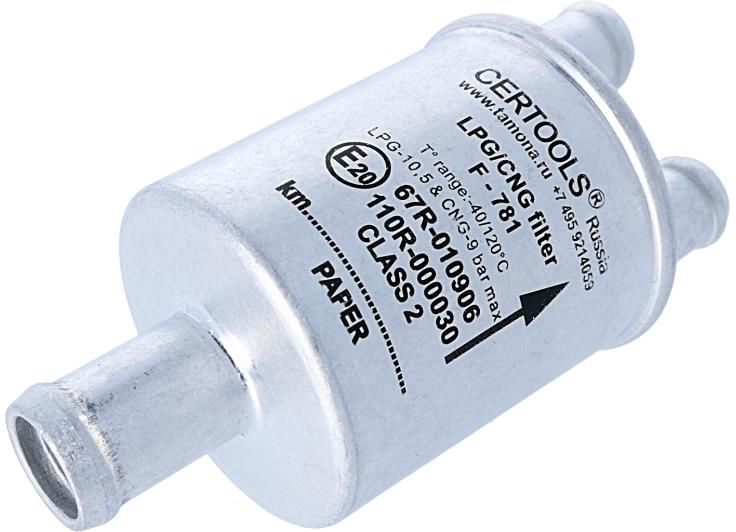 Opis produktu Jednorazowy filtr fazy lotnej model F-781 firmy Certools. Zalecana wymiana filtra co 20 000 km. Opis zastosowania Filtr fazy lotnej przeznaczony do instalacji czwartej generacji sekwencyjnego wtrysku gazu w fazie lotnej. Dane techniczne Jednorazowy filtr w aluminiowym korpusie o długości całkowitej 98 milimetrów. Króciec wejścia gazu o średnicy 16 milimetrów, dwa króćce wyjścia gazu o średnicy 12 milimetrów, wkład filtrujący z bibuły, określony na obudowie kierunek przepływu gazu. Ciśnienie kwalifikacyjne 450 kPa, zakres zalecanej temperatury pracy od -40 do +120 stopni Celsjusza. E20-67R-010906 E20-110R-000030 Cechy produktu Typ filtra: jednorazowy Wkład: bibuła (papier) Wejście: 16 mm Wyjście: 2 x 12 mm Obudowa: metal Sposób montażu: na przewodzie Informacje dodatkowe Kod produktu Nagaz: 32.CRT.875 Producent: CERTOOLS Kod producenta: 55-781-016212G Numer homologacji: E20-67R-010906