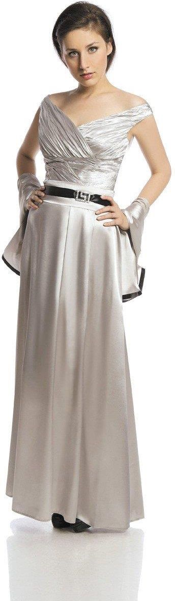 Fason: rozkloszowana, odcięta w pasie Dekolt przód: dekolt szpic Plecy: dekolt szpic Zapięcie: suwak kryty z tyłu Materiał: tkanina elastyczna - satyna Długość całkowita: maxi Rękaw: brak Ozdoby: klamra, draperia