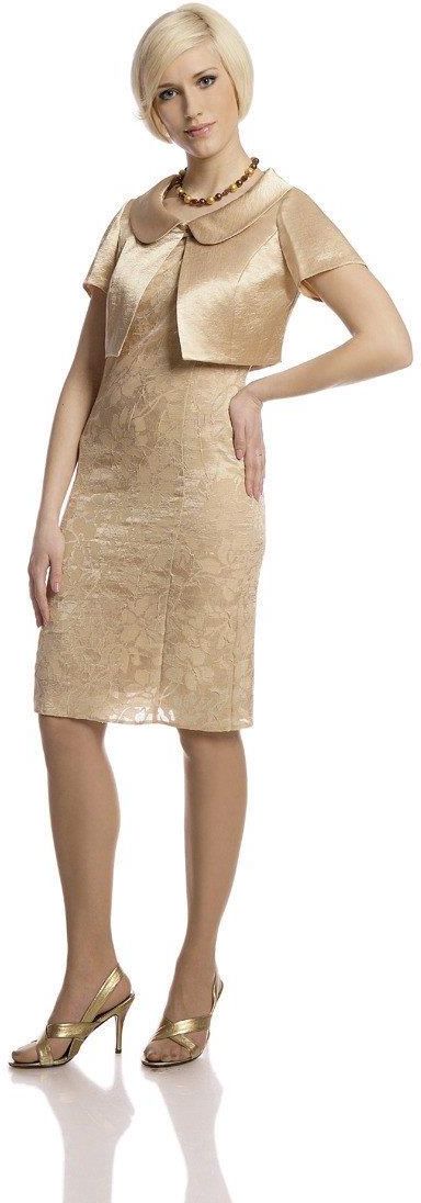 Sukienka: midi, prosta dekolt okrągły szerokie ramiączka suwak kryty z tyłu rozporek z tyłu tkanina wzorzysta, podszewka Żakiet: krótki kołnierz okrągły zapięcie guzik rękaw krótki tkanina atłas