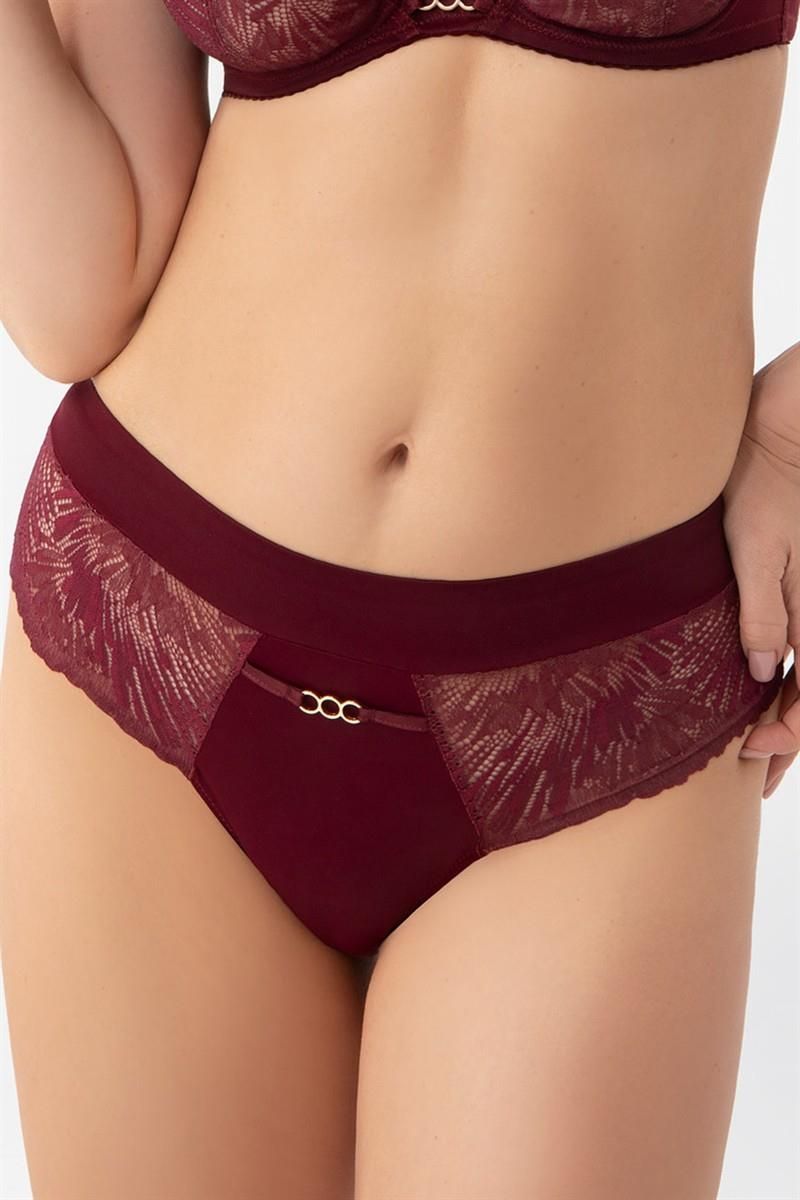 GORSENIA FIGI DAMSKIE MILA K957 Wyższy stan Zabudowany fason zasłaniający prawie całe pośladki Wykonane z kryjącej microfibry oraz koronki elastycznej Szeroki pas z microfibry Tył wykończony brzegiem koronki Metalowe elementy w kolorze jasnego złota (nie zawierają niklu) Bawełniany kroczek
