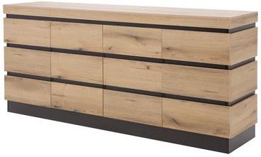 Potrzebujesz więcej miejsca? Nie wiesz gdzie schować zastawę, sztućce i wykrochmalone obrusy? Ta komoda CORTE bez problemu pomieści nadprogramowe talerze, szklanki i kieliszki, bo ma aż 201,2 cm szerokości i 10 wnęk. Komoda nie ma uchwytów, a specjalnie wyprofilowane drzwi, aby ułatwić otwieranie. Jest częścią kolekcji masywnych mebli z szarymi elementami - idealnych do nowoczesnych i loftowych wnętrz. WNĘTRZE We wnętrzu znajduje się aż 10 wnęk. Na każdej półce postawisz przedmioty o wadze do 5 kg. 2 szuflady przydadzą się na drobiazgi - możesz je obciążyć do 3 kg. Dzięki prowadnicom z cichym domykiem, szuflady nie trzaskają. WYKOŃCZENIE Komodę pokryto laminatem z ciekawym rysunkiem drewna. Ciemne dekory układają się w pasiasty wzór, co nadaje komodzie nowoczesny wygląd. Tak wykończona komoda świetnie zaprezentuje się wśród betonowych ścian i drewnianych dekoracji. Możesz wpasować ją we wnętrza z motywem pasów.