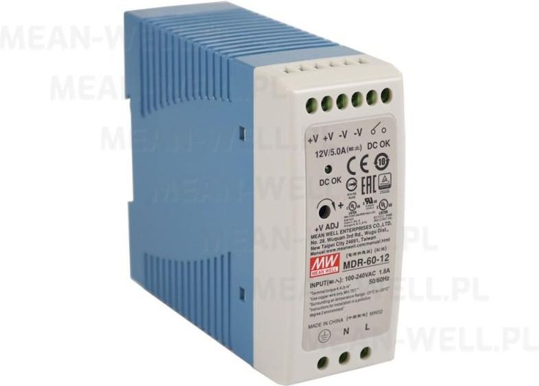 Zasilacz na szynę DIN 60W MDR-60-12 Firma MEAN WELL Zasilacze na szynę DIN marki MEAN WELL są to zasilacze przemysłowe posiadające wysoki stopień ochrony, który zapewnia zabezpieczenie przed warunkami zewnętrznymi, posiadają również wysokie parametry dotyczące mocy i sprawności. Zasilacze charakteryzują się długim okresem nieprzerwanej mocy. Urządzenia na szynie DIN najczęściej są stosowane w systemach automatyki, technikach oświetleniowych, elektronice przemysłowej oraz w takich systemach gdzie wymagane jest sterowanie maszynami. Opis zasilacza MDR-60-12 Zasilacz MDR-60-12 to wysoce niezawodne i wydajne urządzenie zasilające, zaprojektowane specjalnie do zastosowań przemysłowych i komercyjnych, gdzie niezawodność, stabilność oraz wysoka wydajność są kluczowe. Zasilacz MDR-60-12 zapewnia stabilne napięcie wyjściowe o wartości 12V DC przy mocy wyjściowej 60W. Oferuje wysoką efektywność energetyczną, co przekłada się na zmniejszone straty energii i niższe koszty eksploatacji. Zabezpieczenia przeciwzwarciowe, przeciążeniowe, nadnapięciowa i nad temperaturowa zapewniają bezpieczną i niezawodną pracę zasilacza oraz podłączonych do niego urządzeń. Zaprojektowany tak, aby zajmować minimalną ilość miejsca, co ułatwia jego instalację nawet w miejscach o ograniczonej przestrzeni. Opis serii Seria zasilaczy MDR to wysoce niezawodne i wydajne urządzenia zasilające, zaprojektowane specjalnie do zastosowań przemysłowych i komercyjnych, gdzie niezawodność i stabilność są kluczowe. Zasilacze z serii MDR cechują się wysoką efektywnością, zaawansowanymi funkcjami ochronnymi oraz kompaktową konstrukcją, co sprawia, że są idealnym rozwiązaniem dla szerokiego spektrum zastosowań. Cechy: • Uniwersalne wejście AC / Pełny zakres • Zabezpieczenia: Zwarcie / Przeciążenie / Przepięcie • Chłodzenie przez swobodną konwekcję powietrza • Może być zainstalowany na szynie DIN TS - 35 / 7,5 lub 15 • Klasa 1, Dział 2 Miejsca niebezpieczne T4 • Wskaźnik LED włączenia zasilania • Wbudowany aktywny sygnał DC OK • Pobór mocy bez obciążenia < 0,75 W • 3 lata gwarancji Zastosowanie Automatyka przemysłowa: Sterowniki PLC, panele HMI, czujniki i przetworniki. Systemy bezpieczeństwa: Monitoring wizyjny (CCTV), systemy alarmowe. Telekomunikacja i IT: Urządzenia sieciowe, systemy UPS. Elektronika użytkowa: Drukarki, skanery, oświetlenie LED. Automaty vendingowe i kioski informacyjne: Automaty sprzedażowe, kioski informacyjne. Przemysł motoryzacyjny: Linie produkcyjne, systemy testowe. Przemysł energetyczny: Systemy zarządzania energią, magazynowanie energii. Specyfikacja Napięcie wyjściowe: 12V Moc wyjściowa: 60W MAX prąd na wyjściu: 5A Regulacja napięcia na wyjściu: 12 ~ 15V Napięcie wejściowe: 85 ~ 264VAC Temperatura pracy: -30 ~ +70 C Certyfikaty bezpieczeństwa: UL508, UL60950-1, Class I, Div.2 Group A, B, C, D Hazardous Locations T4, EAC TP TC 004, BSMI CNS14336-1 approved Model: MDR-60-12 Wymiary: 40 x 90 x 100mm Waga: 330g Gwarancja: 3 Lata