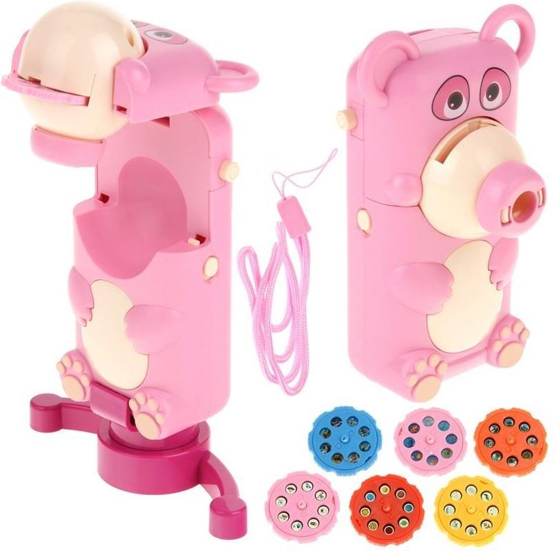 Poręczny projektor w kształcie misia sprawdzi się jako idealna propozycja dla maluchów lubiących malować i rysować. Dzieci, które dopiero zaczynają naukę rysowania, z wielką chęcią zainteresują się odwzorowaniem pięknego rysunku w różnych kolorach. Dzięki takiej zabawie dziecko ćwiczy rączkę i uczy się, w jaki sposób prowadzić kreskę, aby narysować to, co zechce. Rzutnik sprawdzi się też jako maszyna do przedstawiania projekcji. Wystarczy zgasić światło, włączyć aparat i skierować go na sufit lub ścianę. Projektor posiada regulację ostrości wyświetlanego obrazu, wystarczy odkręcić pokrętło umieszczone na nosie misia. W zestawie znajduję się 6 wymiennych dysków. Na każdym dysku znajduje się 8 tematycznych zdjęć, przedstawiających: planety, zwierzęta safari, zwierzęta wodne, dinozaury oraz pojazdy i przedmioty kosmiczne. W skład zestawu wchodzi: - projektor - stojak - smycz - 6 dysków ze slajdami Odpowiedni wiek: 3 lata+ Wymiary projektora na stojaku: 12,5 (szer.) x 8 (gł.) x 18,5 (wys.) cm Zasilanie: 3 baterie AAA (brak w zestawie) Wymiary opakowania: 9 (szer.) x 7 (gł.) x 16,5 (wys.) cm Informacja od producenta: Nie nadaje się dla dzieci w wieku poniżej 36 miesięcy. Zawiera małe części, które łatwo połknąć lub które mogą się dostać do dróg oddechowych. Niebezpieczeństwo uduszenia.