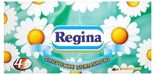 Regina Chusteczki higieniczne rumiankowe 96 sztuk Regina Chusteczki Rumiankowe są produkowane z czterech warstw miękkiej bibułki przy wykorzystaniu 100% celulozy. Dzięki temu są delikatne i nie podrażniają skóry nosa. Naturalny zapach rumianku przynosi ulgę, a subtelny nadruk czyni ten produkt wyjątkowo estetycznym. Informacja o produkcie Warstwy: 4 Ilość listków w pudełku: 96 Rozmiar listka: 20 x 21 cm Wykonano z czystej celulozy Produkt posiada atest PZH.