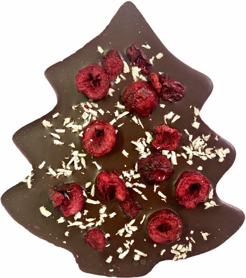 Choinka z czekolady Składniki: czekolada gorzka 72% (masa kakaowa, ksylitol {substancja słodząca}, masło kakaowe, emulgator: lecytyna słonecznikowa), owoce liofilizowane 7% wiśnie, kokos 0,5%. Minimalna zawartość masy kakaowej 72% Delikatne połączenie aromatycznej ciemnej czekolady słodzonej …