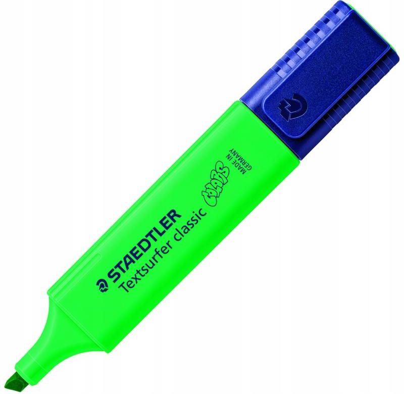 Cechy produktu zakreślacz z dużym zbiornikiem atramentowym, idealny do oznaczania teksty i kolorowania większych obszarów, atrament na bazie wody, szybkoschnący, Twist Cap dla łatwego otwierania, ultra miękka końcówka dłuta ok. 1-5 mm, bezpieczny w samolocie - automatyczne wyrównanie ciśnienia zapobiega wyciekaniu atramentu. Kraj produkcji: DE Producent: STAEDTLER SE Moosaeckerstraße 3 90427 Nuernberg (DE) tel: +49 911 - 93 65- 0 email: info@staedtler.com