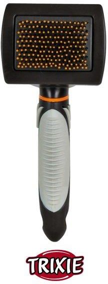 Szczotka do pielęgnacji sierści wykonana jest z plastikowego włosa, zabezpieczonego plastikowymi kuleczkami na końcówkach tak, aby szczotkowanie było delikatne i sprawiało zwierzęciu przyjemność. Szczotka jest odpowiednia dla kotów, psów, królików oraz dużych gryzoni jak np. świnka morska. Szczotka wykonana jest z wysokiej jakości plastiku oraz posiada gumowy, antypoślizgowy uchwyt, dzięki czemu pewnie trzyma się w dłoni. Szczotkowanie jest dla zwierząt bardzo ważne. Należy czesać zwierzątko przynajmniej raz w tygodniu. Regularne szczotkowanie doskonale pobudza krążenie krwi w skórze, co ma bardzo duży wpływna jakość i piękny wygląd sierści czy włosa. Regularne szczotkowanie pozwala usunąć martwą sierść oraz kontrolować ją pod kątem obecności pasożytów. Wymiary szczotki szerokość całkowita: 7 cm długość całkowita: 17 cm szerokość powierzchni czeszącej: 3 cm długość powierzchni czeszącej: 5 cm Szczotka jest odpowiednia dla sierści krótkiej, średniodługiej, długiej oraz włosów. Szczotka sprawdzi się przy sierści szorstkiej jak i gładkiej oraz sierści z grubym podszerstkiem. Przykładowe rasy Psów Border Collie, Golden Retriever, Labrador Retriever, Yorkshire Terrier, Maltańczyk, Spaniel, Rottweiler, Beagle, Mops, Owczarek Niemiecki, Husky, Jamnik Szorstkowłosy, Airedale Terrier, Cairn terrier, Fox Terrier, Sznaucer. Kotów Main Coon, Norweski Leśny, Pers, Kot Europejski Krótkowłosy, Kot Egzotyczny, Kot Kartuski, Kot Syjamski producent: TRIXIE kod produktu: TX-24141