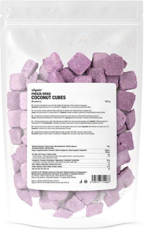 Składniki: Liofilizowane jagody 55%, mleko kokosowe 45%. Przekąska liofilizowane kostki jagoda & mleko kokosowe Przekąska owocowa od Vilgain - tylko dwa składniki! Liofilizowane jagody z mlekiem kokosowym tworzą kostki, które są zarówno smaczną przekąską stworzona tylko z naturalnych składników, ale również świetnie sprawdzą się jako dodatek do owsianek, deserów. Liofilizowane kostki to lekkie i niebanalne owocowe przekąski. Duża paczka starczy na dłużej - można je dawkować i zachowają świeżość dzięki opakowaniu typu doypack (można je wielokrotnie zamykać i otwierać). Zalecamy szczelne zamykanie lub przesypanie do słoika aby go szczelnie zakręcić. Wegańskie, bez substancji słodzących i cukrów dodanych (zawierają naturalnie występujące cukry). Wysoka zawartość błonnika, niska zawartość tłuszczu. Bez glutenu w składnikach, bez lecytyny i bez barwników. Polecamy również inne smaki i duży wybór owocowych przekąsek z naszej oferty. Wartość odżywcza w 100 g: Wartość energetyczna: 1558 kJ / 382 kcal Tłuszcze: 1,2 g w tym kwasy tłuszczowe: 0,1 g Węglowodany: 82,1 g w tym cukry: 69 g Błonnik: 6 g Białko: 5,5 g Sól: 0 g