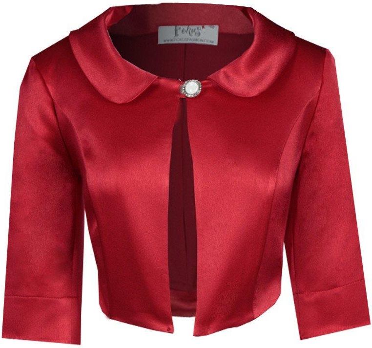 Fason: prosty, krótki Dekolt przód:okrągły kołnierz Zapięcie: guzik Rękaw: 3/4 Materiał: tkanina z połyskiem, podszewka
