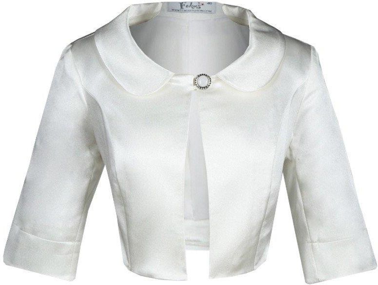 Fason: prosty, krótki Dekolt przód:okrągły kołnierz Zapięcie: guzik Rękaw: 3/4 Materiał: tkanina z połyskiem, podszewka