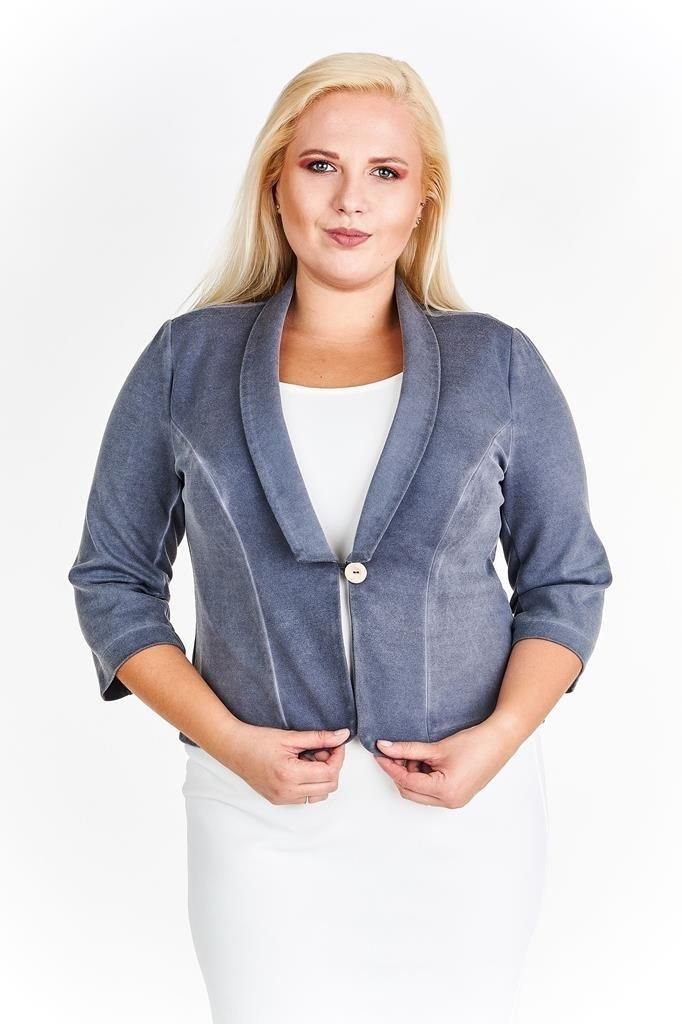 Fason: prosty Dekolt przód: szpic, kołnierz szalowy Zapięcie: guzik Rękaw: 3/4 Materiał: dzianina Skład surowcowy: 79% poliwiskoza, 7% lycra, 7% nylon, 7% spandex