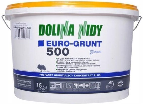 EURO-GRUNT 500 to uniwersalny, głęboko penetrujący preparat gruntujący w postaci żółtego koncentratu, stworzony na bazie żywic akrylowych. Produkt ten został zaprojektowany do profesjonalnego przygotowania podłoży, zarówno wewnętrznych, jak i zewnętrznych. Przeznaczenie: Gruntowanie chłonnych i porowatych powierzchni: Po odpowiednim rozcieńczeniu, koncentrat jest idealny do gruntowania chłonnych i porowatych powierzchni, zarówno wewnątrz, jak i na zewnątrz budynków. Przygotowanie podłoża: Rekomendowany szczególnie przed nakładaniem tynków i gładzi gipsowych, tynków cementowych, warstw wyrównawczych oraz klejów gipsowych i cementowych zapraw klejących. Różnorodne metody aplikacji: Preparat może być nanoszony ręcznie lub maszynowo, z użyciem malarskich urządzeń natryskowych, co zwiększa jego wszechstronność w zastosowaniach. Główne właściwości: Głęboka penetracja: EURO-GRUNT 500 charakteryzuje się wysoką zdolnością penetracji, co pozwala mu wnikać głęboko w stare i suche podłoża, wzmacniając je i ujednolicając całą powierzchnię. Regulacja chłonności: Preparat skutecznie reguluje proces chłonności podłoża, co poprawia warunki wiązania oraz zwiększa przyczepność kolejnych warstw. Równomierne wiązanie i wysychanie: Dzięki użyciu EURO-GRUNT 500, nakładane warstwy wiążą i wysychają równomiernie, co jest kluczowe dla trwałości i estetyki wykończenia. Łatwość oceny pokrycia: Po wyschnięciu preparat tworzy powłokę, która ułatwia ocenę równomierności pokrycia powierzchni gruntem. Paroprzepuszczalność: Grunt jest przepuszczalny dla pary wodnej, co pozwala na "oddychanie" ścian i zapobiega tworzeniu się wilgoci. Wydajność i oszczędność: Bardzo wydajny produkt, który dzięki swoim właściwościom zmniejsza zużycie materiału nawierzchniowego, co może przełożyć się na redukcję kosztów w projekcie.