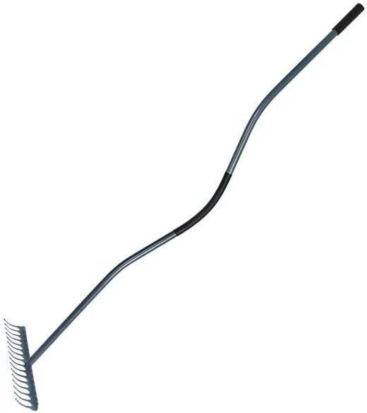 Grabie metalowe z wygiętym trzonkiem 30 cm. Najważniejsze cechy: - 12 zębów, - miejsca uchwytu powleczone tworzywem sztucznym, - długość trzonka 130 cm, - trzonek metalowy, gięty.