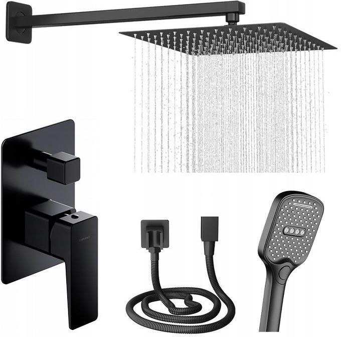 Zestaw system podtynkowy z baterią czarny mat W skład zestawu wchodzi: 1/ Bateria podtynkowa - element natynkowy - element podtynkowy 2/ Deszczownica 30x30 3/ Ramię prysznicowe 4/ Słuchawka 5/ Wąż 6/ Przyłącze kątowe z uchwytem - ZESTAW JEST KOMPLETNY DO MONTAŻU Bateria podtynkowa Marka: Omnires …