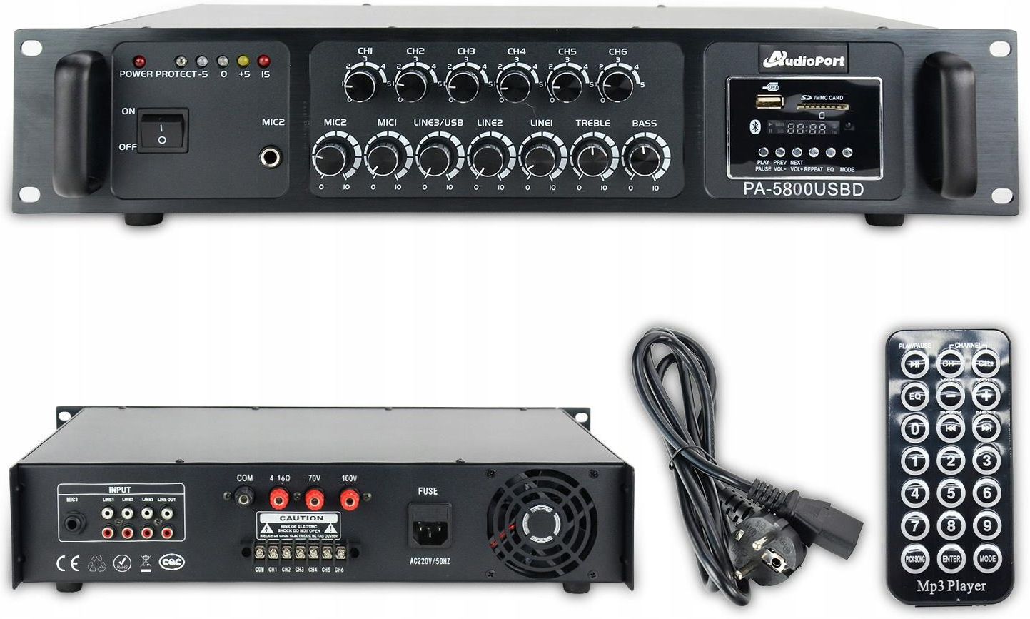 Wzmacniacz audio 800W/100V 6 stref bluetooth radio FM USB pilot Audioport Kod produktu: AKW.242 Wzmacniacz PA-5800 Audioport – Moc 800W/100V dla systemów nagłośnienia 100V Audioport PA-5800 to profesjonalny wzmacniacz z Bluetooth o mocy 800W, zaprojektowany specjalnie do pracy w systemach nagłośnienia 100V. Łączy w sobie funkcje klasycznego wzmacniacza audio, miksera oraz odtwarzacza multimedialnego, co sprawia, że jest idealnym rozwiązaniem do szkół, biur, centrów handlowych, supermarketów i obiektów przemysłowych. Dzięki technologii Bluetooth, a także obsłudze USB, SD i radia FM, urządzenie pozwala na odtwarzanie muzyki bezpośrednio ze smartfonu, tabletu czy laptopa, czyniąc je wszechstronnym narzędziem w codziennym użytkowaniu. Moc, czystość dźwięku i efektywność Wzmacniacz Audioport PA-5800 oferuje aż 800W RMS mocy wyjściowej, co pozwala na efektywne nagłośnienie zarówno małych pomieszczeń, jak i rozbudowanych instalacji wielostrefowych. Dzięki pracy w klasie AB, urządzenie zapewnia czysty, dynamiczny dźwięk, a jednocześnie charakteryzuje się energooszczędnością i stabilnością nawet przy długotrwałej pracy. Profesjonalna konstrukcja i łatwa obsługa Konstrukcja wzmacniacza oparta na metalowej ramie i aluminiowym panelu czołowym gwarantuje trwałość i odporność na uszkodzenia. Kompaktowy format rack 19" (2U) umożliwia łatwą integrację z innymi urządzeniami nagłośnieniowymi. Przejrzysty panel przedni z wyświetlaczem LCD pozwala na intuicyjną kontrolę, a pilot zdalnego sterowania ułatwia codzienną obsługę systemu. Dane techniczne Moc wyjściowa: 800W – stabilna praca nawet przy długotrwałym obciążeniu Wejścia/wyjścia: 2 wejścia mikrofonowe (MIC), 3 wejścia liniowe, 1 wyjście liniowe 6 stref nagłośnienia – możliwość indywidualnego włączania/wyłączania nagłośnienia w każdej strefie. Regulacja dźwięku: 2-pasmowy korektor (bass, treble) Impedancja: 4–16 Ohm 70V/ 100V – uniwersalne dopasowanie do różnych systemów nagłośnienia Obsługa multimediów: odtwarzacz MP3, Bluetooth, radio FM, port USB/SD, pilot zdalnego sterowania Zabezpieczenia: ochrona przed zwarciem, przeciążeniem i przegrzaniem Częstotliwość przenoszenia: 80 Hz – 20 kHz Zniekształcenia THD: <1% przy 1/3 mocy znamionowej. Stosunek sygnał/szum (SNR): MIC ≥ 52 dB, Line ≥ 10 dB ? Napięcie zasilania: AC 220V / 50–60 Hz Obudowa: solidna konstrukcja stalowa z aluminiowym panelem i uchwytem 19" mocowanie z możliwością załączenia uchwytów (2U) Wymiary z opakowaniem : 55x 53x 17cm Wymiary wzmacniacza: 48x 46x10cm waga z opakowaniem: 15,5kg Waga wzmacniacza: 14,5kg Kolor: czarny Zastosowanie PA-5800USBD Audioport Wzmacniacz multimedialny PA-5800USBD został zaprojektowany z myślą o dużych przestrzeniach i instalacjach: Szkoły i uczelnie – nagłośnienie sal lekcyjnych, auli, korytarzy. Biura i urzędy – odtwarzanie komunikatów i muzyki tła. Sklepy i supermarkety – emisja reklam głosowych i muzyki w tle. Hale i zakłady przemysłowe – ostrzeganie pracowników i komunikaty alarmowe. Restauracje i hotele – strefowe nagłośnienie sal, lobby i przestrzeni zewnętrznych. Obiekty publiczne i centra handlowe – szerokie nagłośnienie i niezależna kontrola stref.