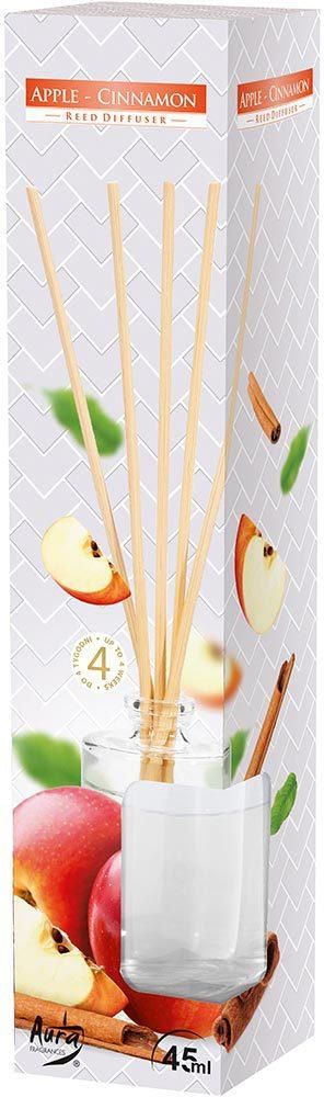 Ciepły i przytulny aromat - Dyfuzor zapachowy Jabłko - Cynamon Dyfuzor zapachowy Jabłko - Cynamon to wspaniała kombinacja aromatów, która zapewnia przyjemne doznania zmysłowe i wprowadza do pomieszczenia ciepły i przytulny klimat. Podany dyfuzor może być szczególnie odpowiedni na chłodne dni, gdy chcemy stworzyć ciepłą i przytulną atmosferę w pomieszczeniu. Zapach jabłka przynosi świeżość i lekkość do mieszanki. Jest to aromat słodki, soczysty i owocowy, który nadaje delikatność całemu doświadczeniu zapachowemu. Cynamon to przyjemny, ciepły i aromatyczny zapach, który dodaje wyrazistości i głębi do mieszanki. Ma charakterystyczny, korzenny aromat, który przypomina o zbliżającym się okresie jesieni i zimie. Połączenie tych dwóch intensywnych aromatów tworzy harmonijną kompozycję, która zaspokaja zmysły, pobudza wyobraźnię i pomaga stworzyć przyjemny klimat w domu czy biurze. Kolekcja dyfuzorów marki AURA to mix unikatowych zapachów zamkniętych w szklanej buteleczce o pojemności 45 ml. Uniwersalny wygląd stanowi doskonały element dekoracyjny każdego wnętrza. Dyfuzor uwalnia zapach przez 4 tygodnie, wypełniając pomieszczenie delikatnym aromatem. Zestaw zawiera 5 patyczków ratanowych, dzięki którym możesz regulować intensywność zapachu Jabłko-Cynamonu w zależności od użytej ilości. Nietuzinkowe połączenie akordów owocowych i korzennych. Podkreśla wyjątkowość chwili i otula swoim wyrazistym zapachem.