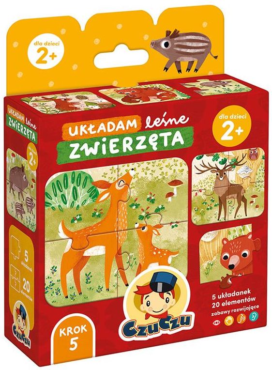 Leśne zwierzęta zapraszają do wspólnej zabawy! Ułóżcie czteroelementowe puzzle i poznajcie mieszkańców lasu. Zestaw doskonale znakomicie sprawdzi się u maluchów, które są gotowe na kolejny etap puzzlowej przygody. Układanie puzzli rozwija koordynację ręka-oko i cierpliwość, a tematyka inspiruje do poznawania przyrody. Czas na las! zestaw zawiera: 5 układanek (20 puzzli) wymiary układanki: 14 x 12,5 cm wymiary pudełka: 13,5 x 18 x 5 cm odpowiednie dla dzieci w wieku 2+ wyprodukowano w Polsce pomysł na edukacyjny prezent doskonałe pierwsze kilkuelementowe puzzle Układam leśne zwierzęta od CzuCzu to świetny pomysł na edukacyjny prezent dla malucha gotowego na układanie coraz trudniejszych puzzli. Możecie zacząć od rozdzielenia elementów poszczególnych układanek, w czym pomogą kolorowe rewersy. Możesz połączyć 3 elementy i poprosić malucha o dołożenie ostatniego. Sprawdź, czy dziecko zna wszystkie zwierzęta. Naśladujcie ich ruchy i odgłosy, nazywajcie kolory i detale, wymyślajcie o nich opowieści. A może pójdziecie na spacer? Producent/osoba odpowiedzialna za bezpieczeństwo produktu Bright Junior Media ul. Syrokomli 20/8, 30-102 Kraków 30-102 Kraków halo@czuczu.pl 534154111