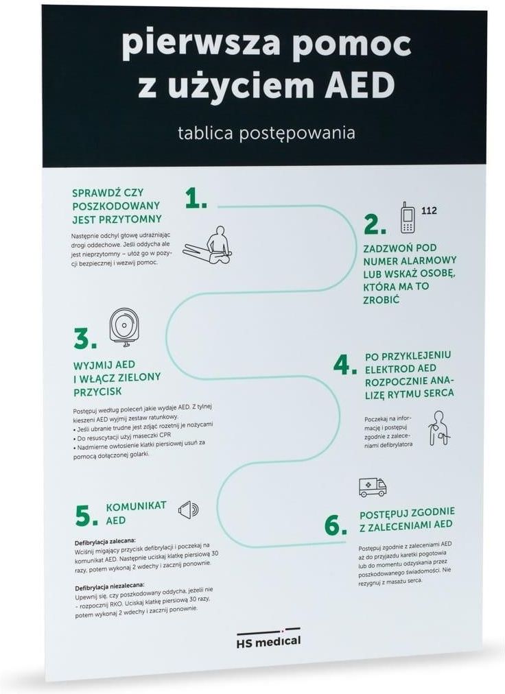Tablica Krok po Kroku to wyjątkowy element edukacyjny, który w prosty i przejrzysty sposób przedstawia etapy udzielania pierwszej pomocy z zastosowaniem defibrylatora zewnętrznego (AED). Została zaprojektowana z myślą o osobach, które mogą potrzebować szybkiej instrukcji w sytuacjach kryzysowych, gdy liczy się każda sekunda. Dzięki tej tablicy, każdy może łatwo zrozumieć, jak prawidłowo i skutecznie wykorzystać defibrylator do ratowania życia.Tablica KROK PO KROKU [60x42]Tablica Krok po Kroku to wyjątkowy element edukacyjny, który w prosty i przejrzysty sposób przedstawia etapy udzielania pierwszej pomocy z zastosowaniem defibrylatora zewnętrznego (AED). Została zaprojektowana z myślą o osobach, które mogą potrzebować szybkiej instrukcji w sytuacjach kryzysowych, gdy liczy się każda sekunda. Dzięki tej tablicy, każdy może łatwo zrozumieć, jak prawidłowo i skutecznie wykorzystać defibrylator do ratowania życia. Cechy Tablicy KROK PO KROKU: Wielkość: Wymiary: 60 x 42 cm, co zapewnia dużą powierzchnię do zamieszczenia szczegółowych instrukcji i grafik. Tablica jest wystarczająco duża, by była czytelna z większej odległości, co jest szczególnie ważne w sytuacjach stresowych. Przejrzysta Instrukcja: Tablica przedstawia czytelne i zrozumiałe grafiki oraz opis kroków, które należy podjąć, aby udzielić pierwszej pomocy, w tym jak używać AED. Instrukcje są proste do wykonania, z dużymi ilustracjami oraz numerami, które prowadzą użytkownika przez cały proces ratowania życia. Etapy Udzielania Pomocy: Krok po kroku przedstawiono działania takie jak: Ocena stanu poszkodowanego i wezwanie pomocy. Podjęcie resuscytacji krążeniowo-oddechowej (RKO). Prawidłowe umiejscowienie elektrod AED i uruchomienie urządzenia. Zastosowanie defibrylacji i dalsza pomoc do momentu przybycia służb ratunkowych. Każdy krok jest opisany w sposób, który może być wykonany przez osobę niemającą dużego doświadczenia w pierwszej pomocy, co ułatwia udzielenie skutecznej pomocy. Zastosowanie Kolorów: Tablica wykorzystuje żywe kolory, aby wyróżnić kluczowe elementy instrukcji i przyciągnąć uwagę do najważniejszych działań w sytuacjach kryzysowych. Trwałość i Odporność: Wykonana z materiałów odpornych na uszkodzenia mechaniczne oraz działanie warunków atmosferycznych, co czyni ją odpowiednią zarówno do użytku wewnętrznego, jak i zewnętrznego. Może być montowana na ścianach szpitali, szkół, centrów handlowych, stacji benzynowych, lotnisk, w miejscach publicznych i innych. Pomoc w Kryzysie: W sytuacjach stresowych, gdy czas ma kluczowe znaczenie, tablica umożliwia szybkie podjęcie odpowiednich działań bez potrzeby szukania szczegółowych instrukcji. Korzyści z Używania Tablicy KROK PO KROKU: Szybka pomoc w sytuacjach kryzysowych – Prosty i szybki dostęp do informacji w momencie, gdy każda sekunda ma znaczenie. Edukacja i świadomość – Pomaga w kształtowaniu świadomości na temat procedur pierwszej pomocy i wykorzystania AED. Uniwersalne zastosowanie – Dzięki jasnym instrukcjom i dużym ilustracjom jest idealna do umieszczenia w publicznych miejscach oraz w firmach, szkołach czy instytucjach. Zwiększenie bezpieczeństwa – Dzięki jasnym wskazówkom, każdy może poczuć się pewniej, pomagając osobom w sytuacjach zagrożenia życia. Zastosowanie Tablicy KROK PO KROKU: Szkoły, biura, hotele, centra handlowe – wszędzie tam, gdzie AED może być potrzebne, a szybka pomoc ratująca życie jest kluczowa. Miejsca publiczne i przestrzenie otwarte, gdzie w sytuacji kryzysowej dostępność AED jest niezbędna, a tablica stanowi doskonałą pomoc. Edukacja ratowników, pracowników – pomoc dla osób, które są odpowiedzialne za pierwszą pomoc w sytuacjach awaryjnych. Tablica Krok po Kroku to niezastąpiony element w każdej lokalizacji, w której dostęp do AED może uratować życie. To narzędzie, które zapewnia jasność i pewność w krytycznych momentach, kiedy każda sekunda się liczy.