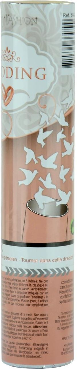 Tuba wyrzutnia konfetti 20cm - białe gołębie Wspaniałe strzelające tuby z białymi gołębiami to cudowna atrakcja podczas wesela, komunii i różnego rodzaju imprez. Co to za uroczystość bez konfetti spadającego z nieba? Współczesne wydarzenia, ślub, wesele, komunia czy koncert, są prawie niekompletne bez pokazu konfetti. To więcej niż tradycja na imprezach, jesteś świadkiem konfetti na większości pokazów scenicznych. Konfetti stało się nieodzownym elementem każdej uroczystości. Część jego popularności wynika również z faktu, że tworzy atmosferę rozrywki i wzrosłości chwili. To wszystko sprawia, że jest to oczywisty wybór na każdą inną imprezę, święto czy podkreślenie ważnej, wyjątkowej chwili w życiu. Konfetti białe gołębie w szczególności takie chwile właśnie podkreśli Wśród wszystkich fanfar uroczystości weselnych konfetti potęguje entuzjazm i radość gości. Co więcej, majestatyczne efekty konfetti stworzą niezapomniany wieczór dla każdego. Opis produktu Tuba - wyrzutnia konfetti Materiał wykonania: tworzywo sztuczne Kolor: biały Rodzaj: gołębie Wysokość całkowita tuby: 20cm Wysokość wystrzału: 3-5 m W celu wystrzelenia należy chwycić mocno jedną ręką za górną część pojemnika, a drugą ręką przekręcić dolną część zgodnie ze strzałkami