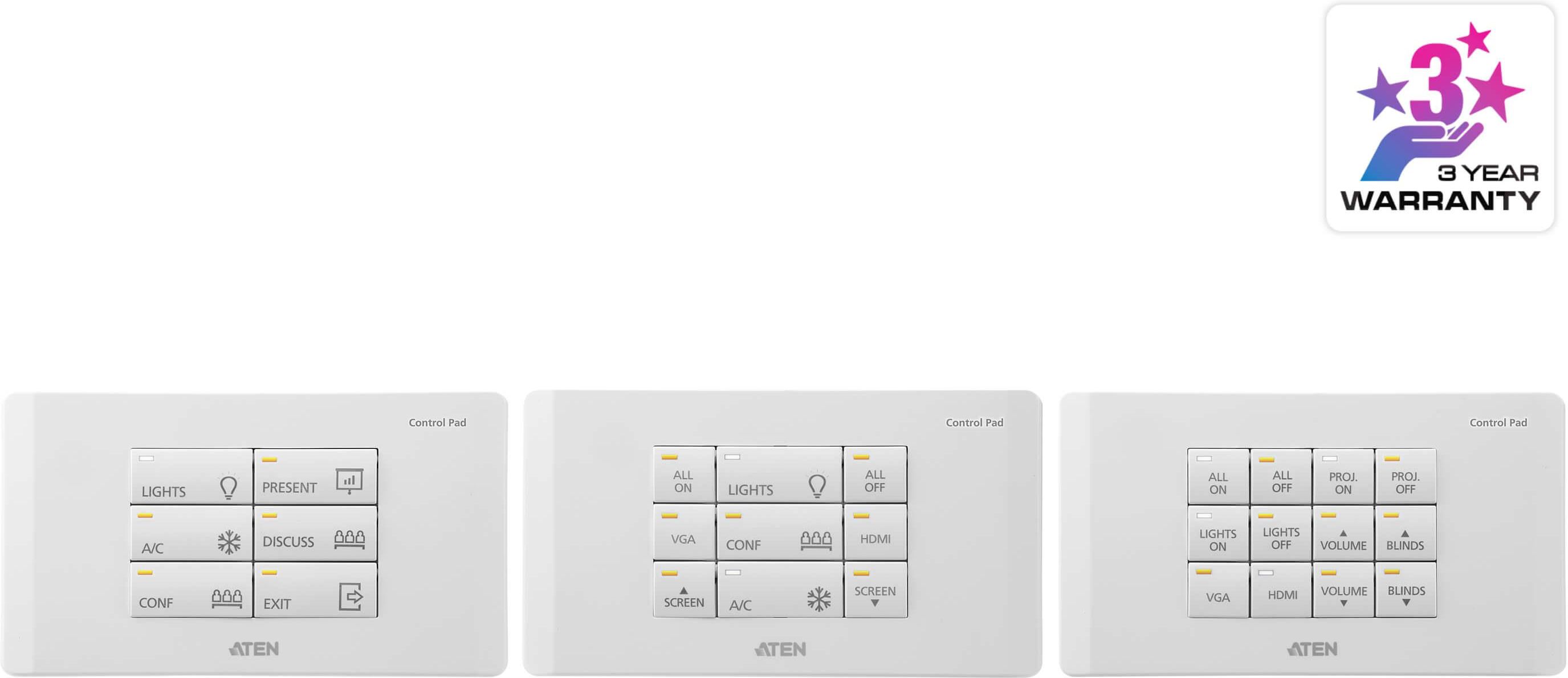 ATEN VK02001 to 12-przyciskowa klawiatura w kolorze czarnym, z możliwością pełnej konfiguracji, integrująca sterownik razem z klawiaturą jako rozwiązanie "wszystko w jednym". Dedykowana do sterowania małą/średnią salą konferencyjną lub klasą szkolną. Klawiatura ta łączy urządzenia oraz konfiguruje za pomocą oprogramowania VK6000 Configurator. Pozwala elastycznie dostosować funkcje oraz układ przycisków na klawiaturze do większości aplikacji.System sterowania ATEN jest systemem zarządzania opartym na sieci Ethernet, łączącym wszystkie urządzenia w pomieszczeniu i umożliwiającym łatwe sterowanie. Klawiatura VK02001 nie tylko łączy urządzenia, ale także działa jako interfejs sterowania z konfigurowalnymi przyciskami i układem. Panel sterowania może być ułożony w 125 różnych kombinacjach od 6 do 12 klawiszy, które zatrzaskują się w bardzo prosty sposób. Przykładowe układy klawiatury: Niestandardowe rozmieszczenie przycisków na panelu sterowania można ustawić w 125 różnych kombinacjach od 6 do 12 przycisków. Powyższy przykład pokazuje 12 najczęściej używanych.