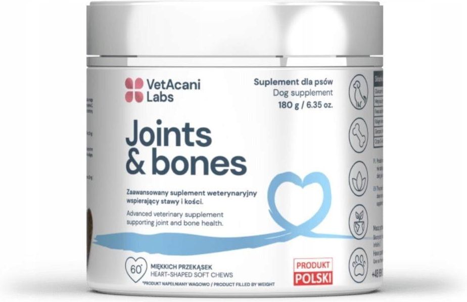 Suplement dla psów VetAcani Joints & Bones 180g Zdrowe stawy i kości psa Suplement dla psów VetAcani - wsparcie zdrowych stawów i kości Twojego psa ❤️ VetAcani Joints & Bones to zaawansowany suplement w formie miękkich przysmaków, opracowany z myślą o wspieraniu zdrowia stawów, mobilności i wytrzymałości kości psów w każdym wieku. To doskonałe wsparcie dla psów aktywnych, sportowych oraz starszych, które potrzebują dodatkowej ochrony układu ruchu. Formuła łączy glukozaminę, MSM, siarczan chondroityny, kolagen wołowy oraz witaminy C i E, które wspomagają regenerację chrząstki, elastyczność stawów i zmniejszają ryzyko stanów zapalnych. Dodatek siemienia lnianego, oleju kokosowego i oleju z łososia dostarcza zdrowych kwasów tłuszczowych, wspierając ogólną witalność oraz kondycję skóry i sierści. Przysmaki o naturalnym smaku wątróbki są bardzo apetyczne, dzięki czemu suplementacja jest łatwa, przyjemna i skuteczna. Korzyści z podawania VetAcani Joints & Bones: wspiera zdrowie stawów, kości i chrząstki, poprawia elastyczność i mobilność, wspomaga regenerację po wysiłku fizycznym, redukuje stany zapalne i sztywność stawów, wzmacnia strukturę kości i chrząstek, idealny dla psów aktywnych, sportowych i seniorów, pomaga utrzymać sprawność i komfort ruchu. Dlaczego warto wybrać VetAcani Labs Joints & Bones? Kompleksowa formuła ochronna - glukozamina, chondroityna, MSM i kolagen wspierają odbudowę stawów i chrząstki. Naturalne dodatki odżywcze - siemię lniane, olej kokosowy i olej z łososia wspierają odporność oraz zdrową skórę. Witaminy C i E - silne antyoksydanty wspomagające regenerację tkanek i ochronę komórek. Smak, który psy uwielbiają - przysmaki o smaku wątróbki chętnie akceptowane nawet przez wybredne psy. Dla psów wszystkich ras i rozmiarów - uniwersalna formuła odpowiednia dla małych i dużych pupili. Bez sztucznych konserwantów i barwników - czysty skład, bez zbędnych dodatków. Skład Inaktywowane drożdże browarnicze, Skrobia ziemniaczana, Płatki ziemniaczane, Gliceryna roślinna, Suszona miazga jabłkowa, Glukozamina z tkanek zwierzęcych (skorupiaki), Metylosulfonylometan (MSM), Rafinowany olej kokosowy, Witamina C, Witamina E, Suszona tapioka, Lecytyna, Kolagen wołowy, Aromat, Mączka z chleba świętojańskiego, Proszek z siarczanu chondroityny, Kwas sorbowy, Olej z łososia, Wytłok z siemienia lnianego, Przeciwutleniacz. Składniki analityczne (na 100 g) Białko: 14,1 g Tłuszcz: 7,9 g Popiół: 3,5 g Błonnik (włókno surowe): 3,8 g Wapń: 92 mg Fosfor: 28 mg Wilgotność: 17,1 Dawkowanie Pies o masie do 10 kg - 1 przysmak dziennie. Pies o masie do 10-30 kg - 2 przysmaki dziennie. Pies o masie powyżej 30 kg - 3 przysmaki. Produkt może być stosowany długotrwale jako uzupełnienie codziennej diety. W Pet Secret znamy sekret zdrowia i dobrego samopoczucia Twojego pupila! Stawiamy na najwyższą jakość, dlatego nasze produkty powstają wyłącznie z naturalnych składników, bez sztucznych konserwantów i zbędnych dodatków. Dbamy o to, by były nie tylko smaczne, ale przede wszystkim zdrowe i bezpieczne – idealne jako codzienne uzupełnienie diety Twojego czworonoga. Wybierając Pet Secret, wybierasz to, co najlepsze dla swojego pupila! Pamiętaj, aby Twój pupil miał zawsze dostęp do świeżej wody pitnej. Produkt nie zastępuje codziennego, pełnoporcjowego pożywienia dla psa. ⭐